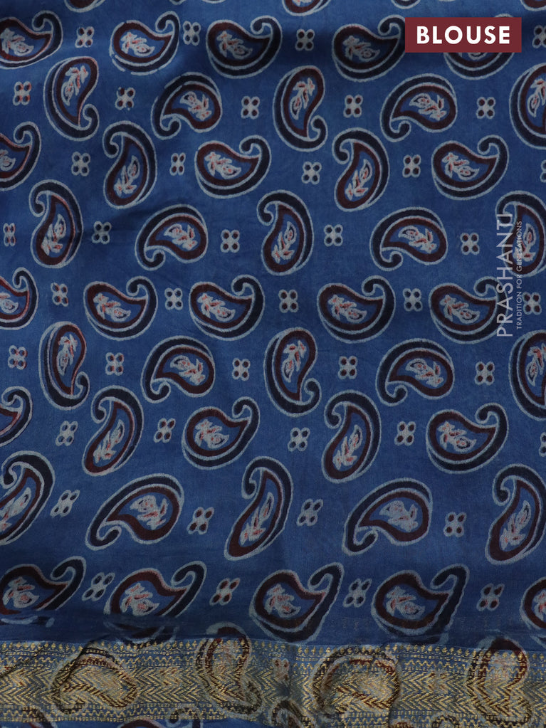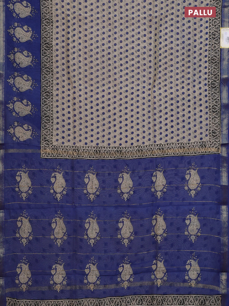 Chanderi bagru saree beige and blue with allover floral butta prints and maheswari border