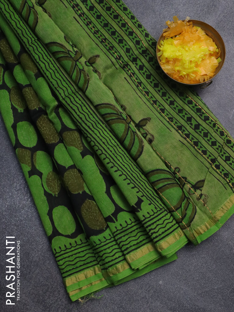 Chanderi bagru saree black and green with allover prints and small zari woven border