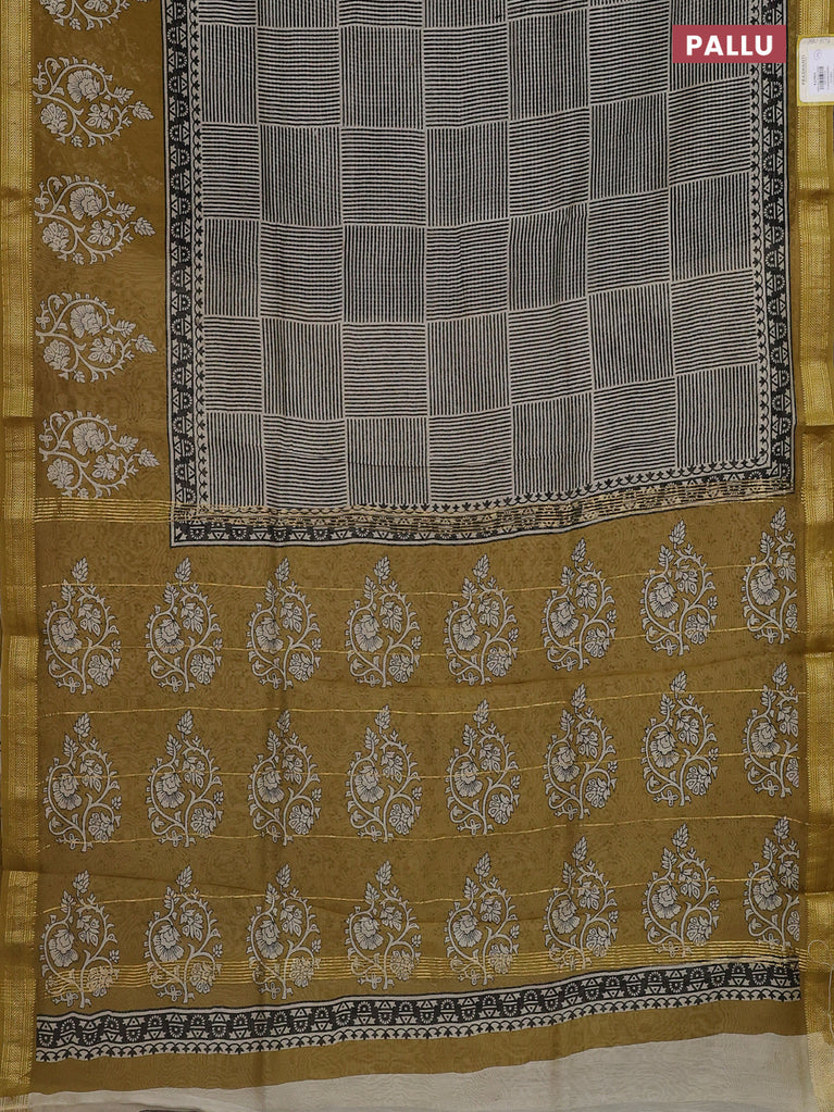 Chanderi bagru saree cream black and mehendi green with allover stripe pattern and maheswari border