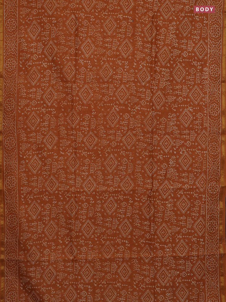 Chanderi bagru saree dark mustard with allover warli prints and small zari woven border