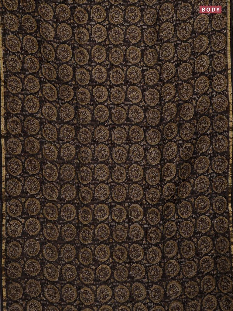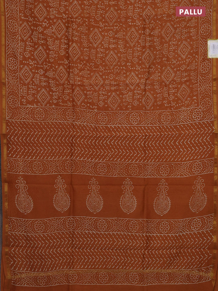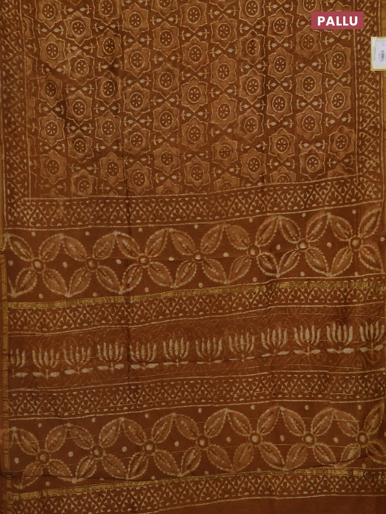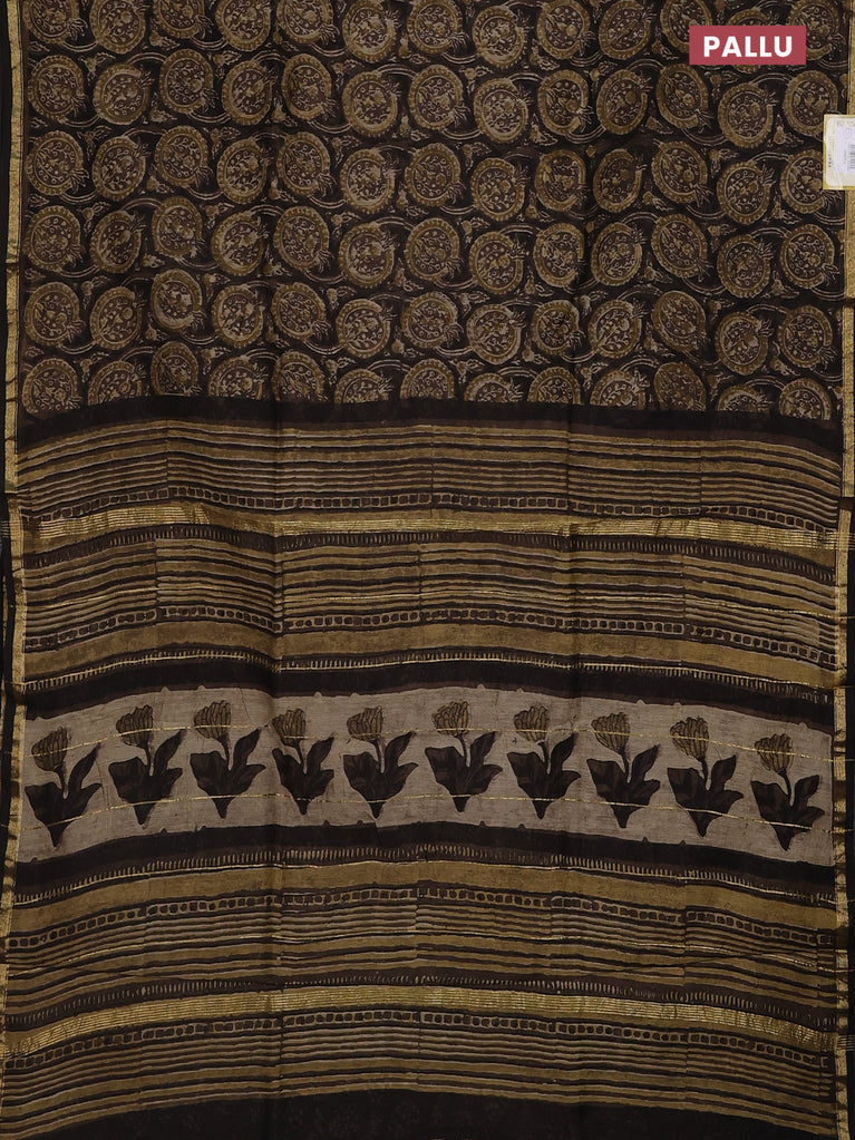 Chanderi bagru saree dark brown with allover prints and small zari woven border