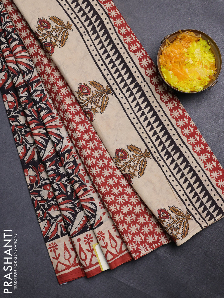 Jaipur cotton saree black and maroon black with allover kalamkari prints and printed border