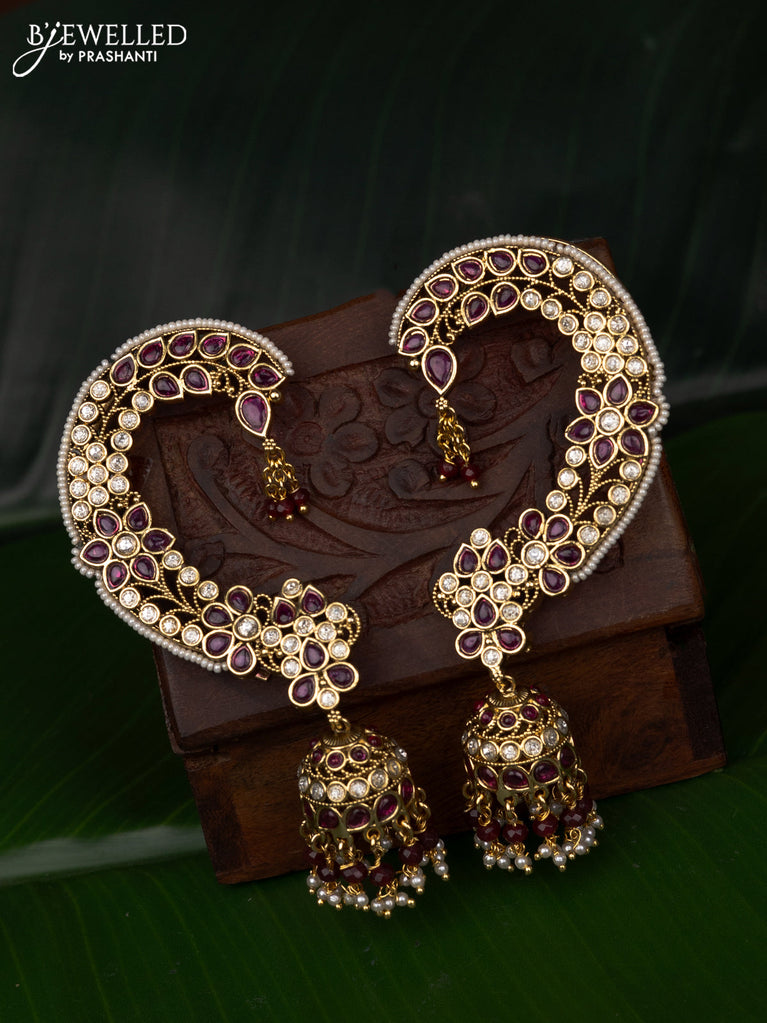Antique earcuff jhumka peacock design with jadau kundan stones and pearl hanging