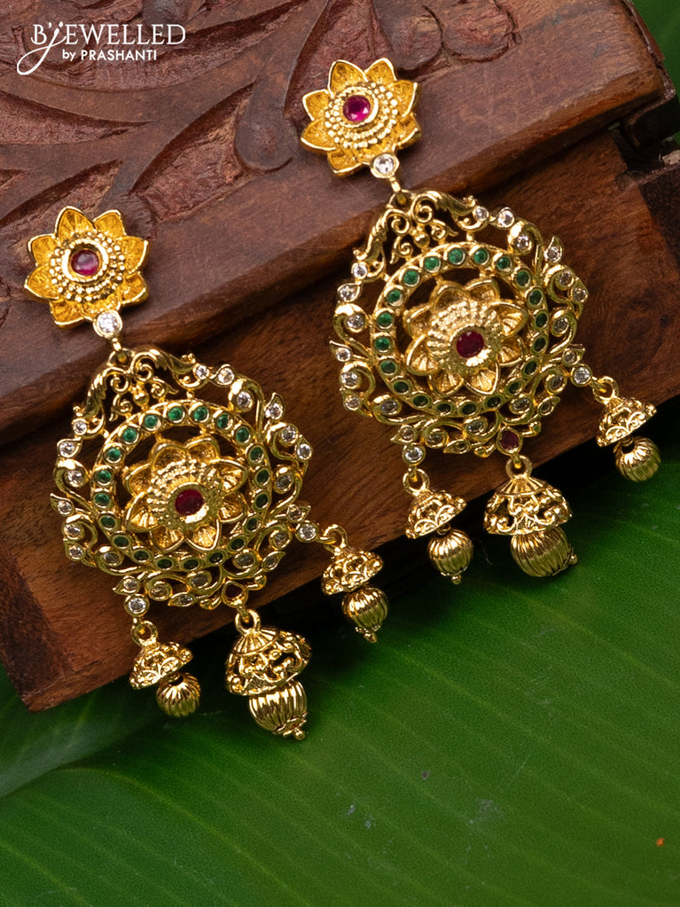 Antique earring floral design with kemp & cz stones and golden beads hanging