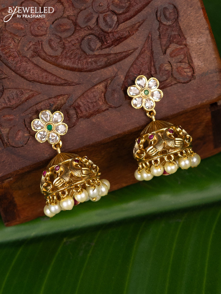 Antique jhumka peacock design with jadau kundan stones and pearl hangings