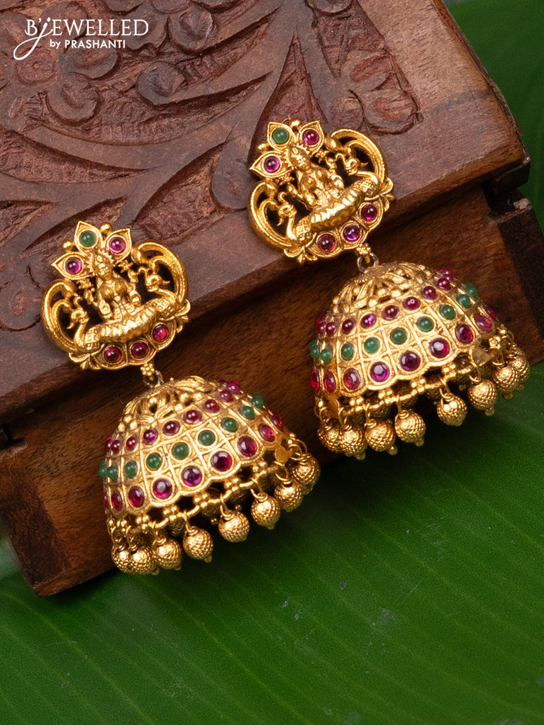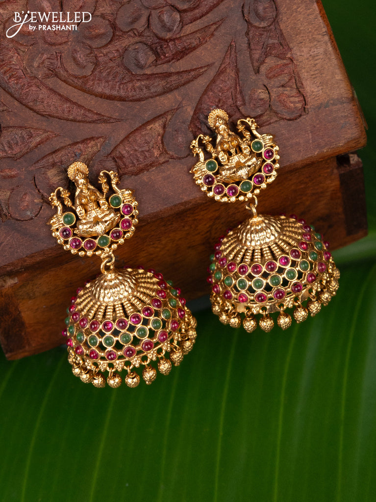 Antique jhumka lakshmi design with kemp stones and golden beads hanging