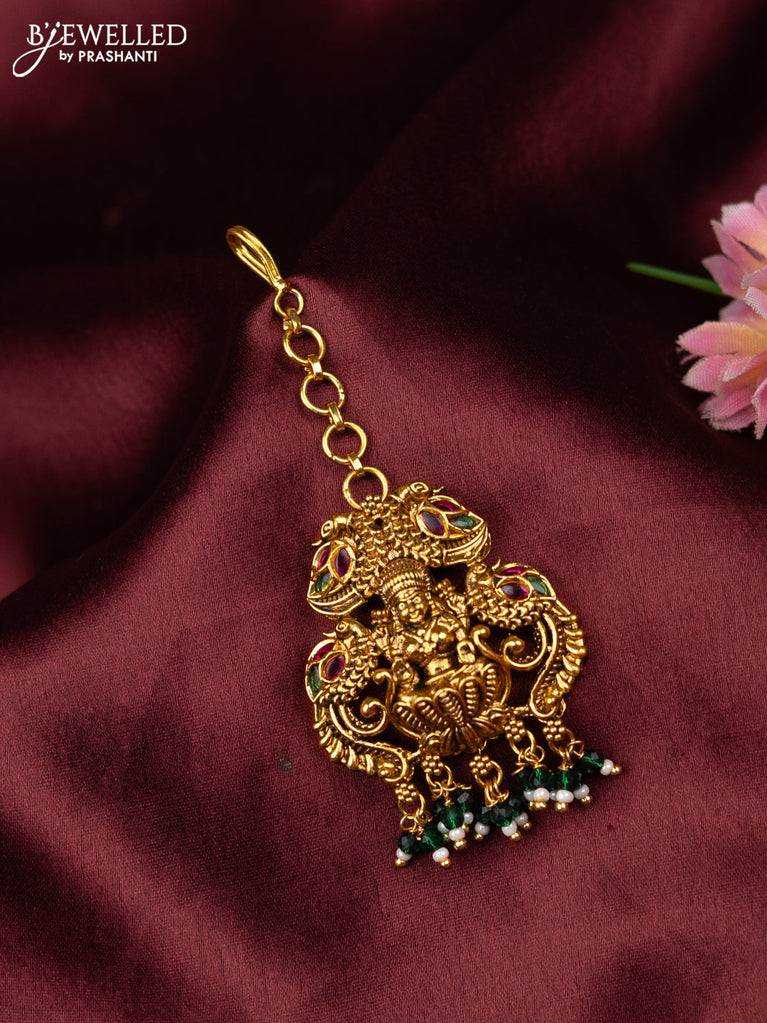 Antique maang tikka lakshmi design with emerald & cz stones and golden beads hangings