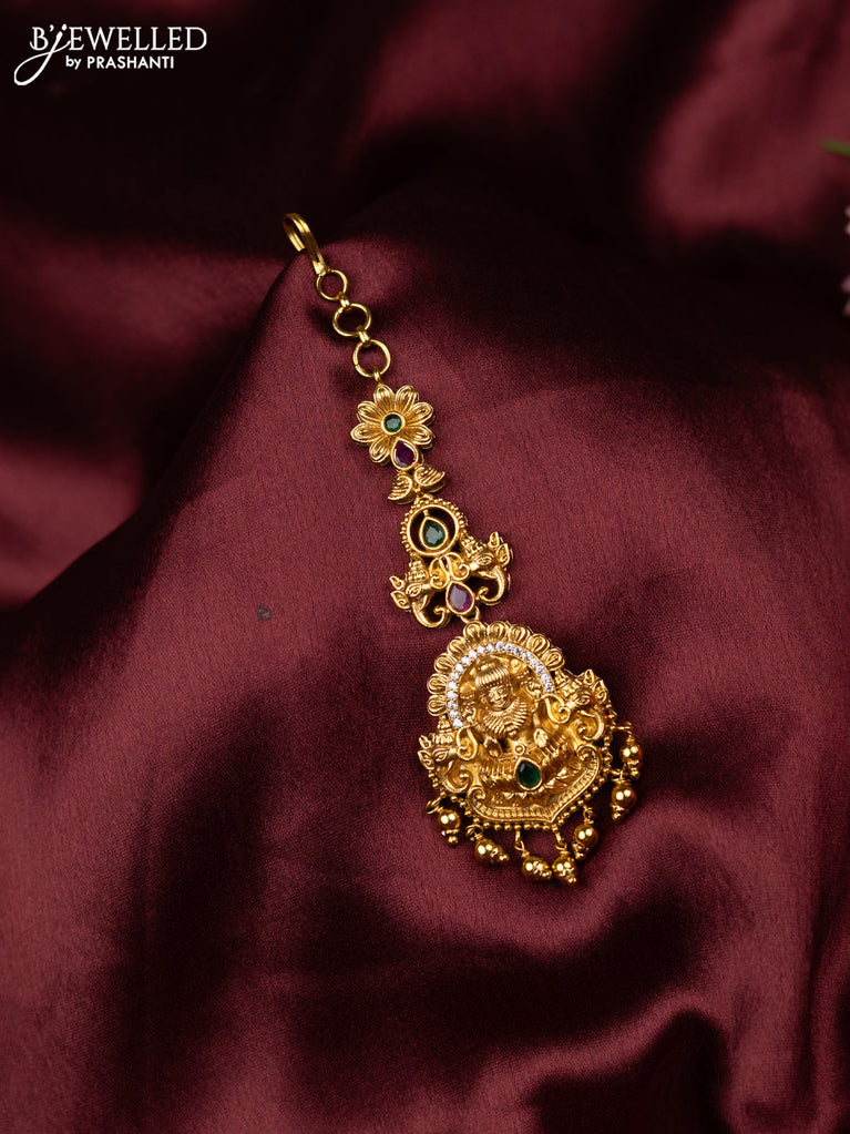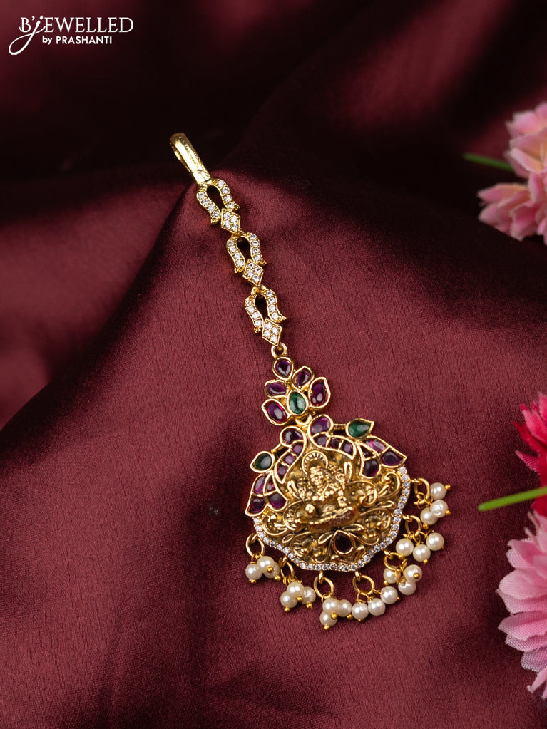 Antique maang tikka lakshmi design with kemp & cz stones and pearl hangings