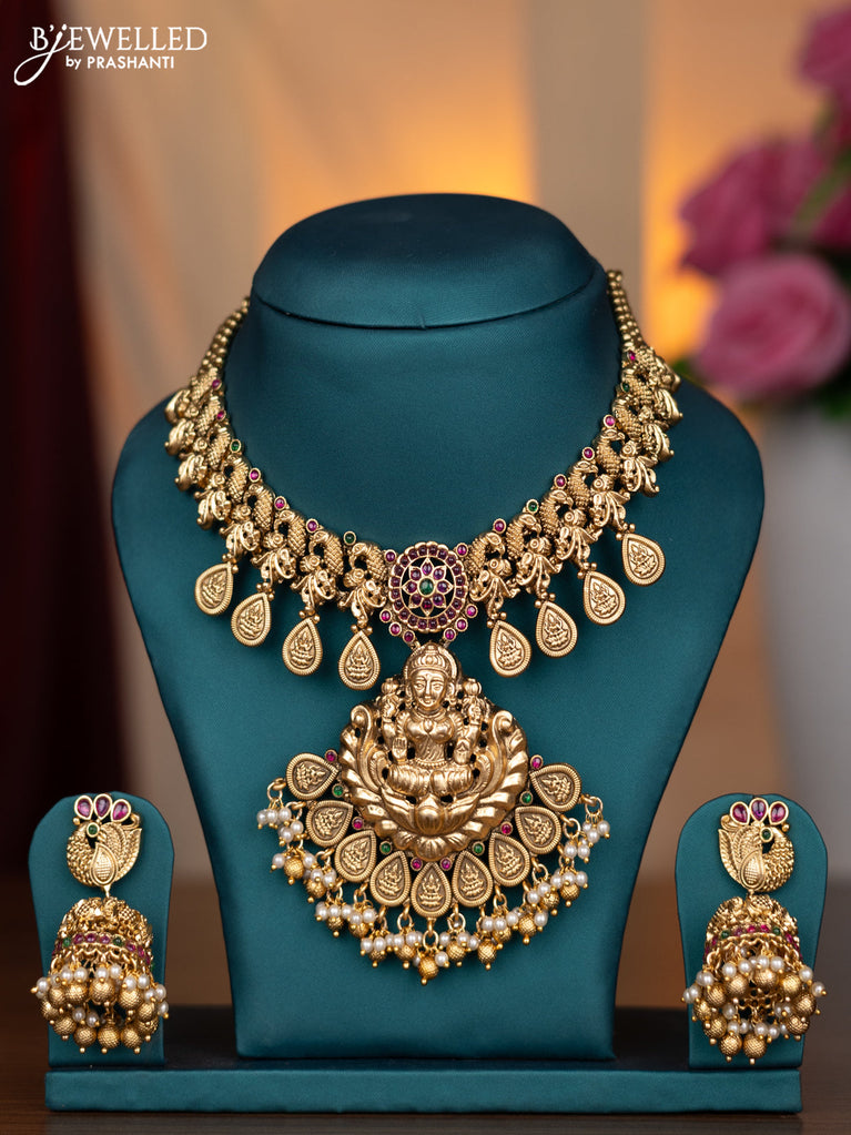 Antique necklace lakshmi design with kemp & cz stones and pearl hangings without earring