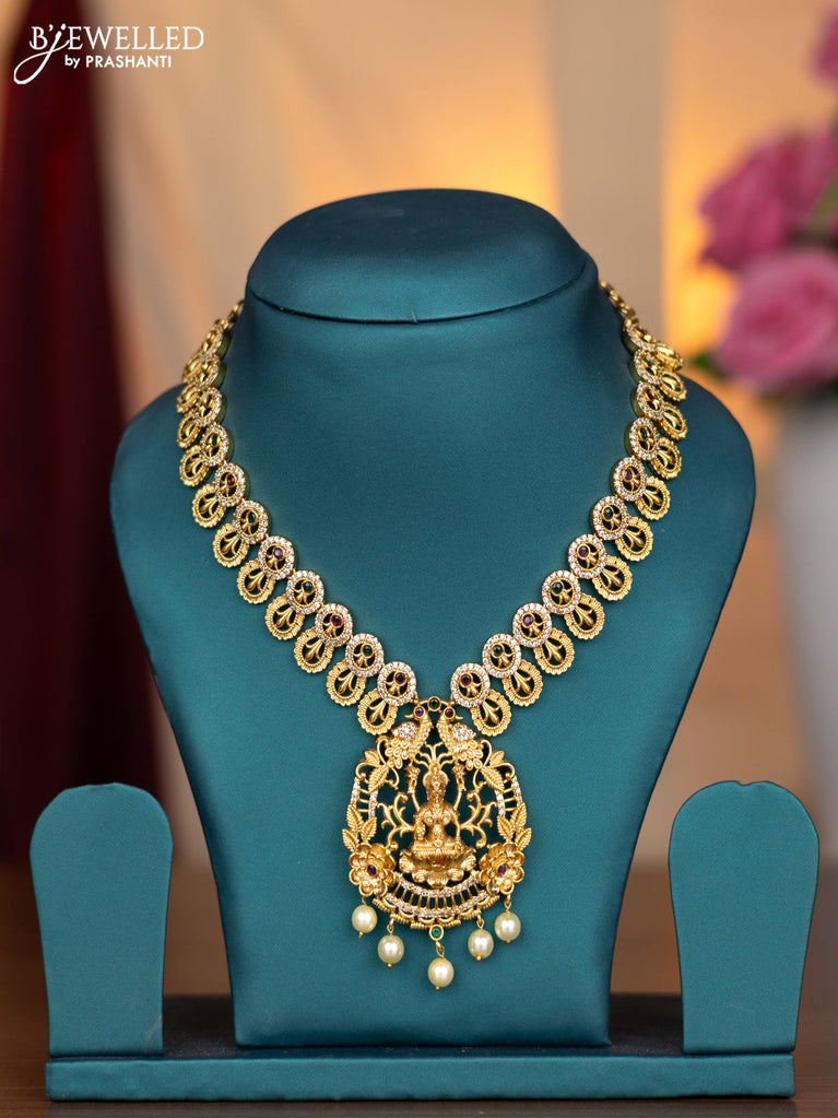 Antique necklace lakshmi design with kemp & cz stones and pearl & green beads hanging