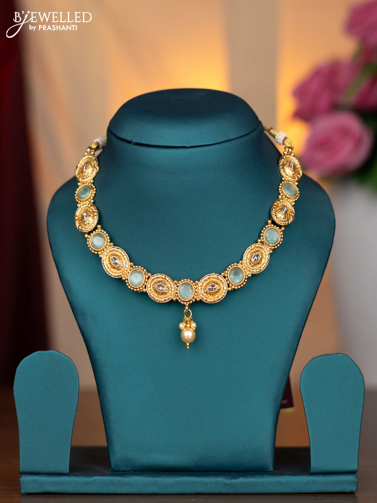 Antique pendant set lakshmi design with kemp & cz stones and golden beads hanging