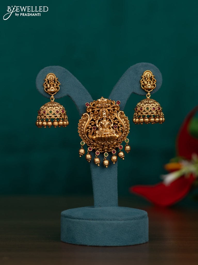 Antique pendant set lakshmi design with kemp stone and golden beads hangings