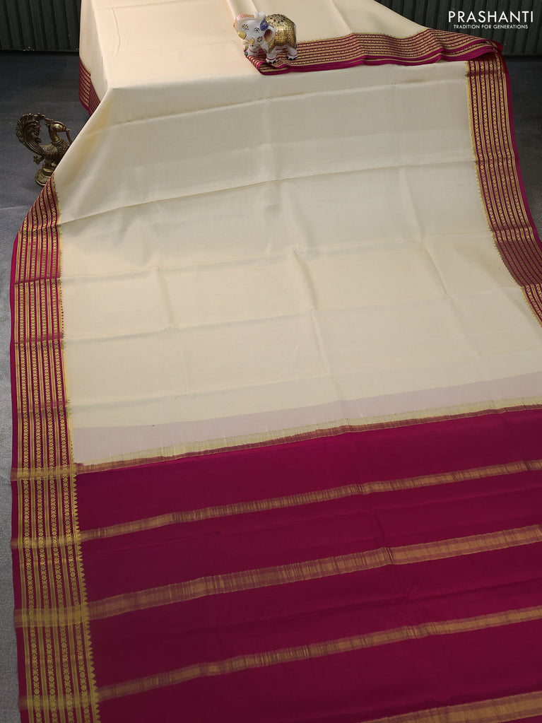 Pure mysore silk saree cream and purple with plain body and zari woven border