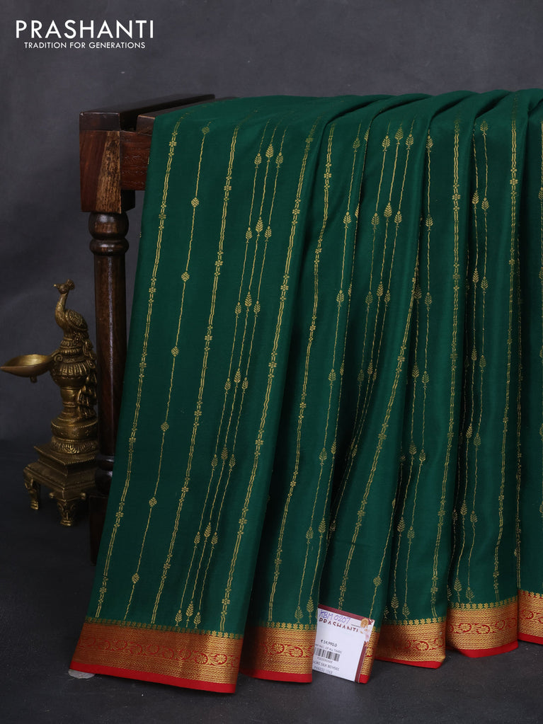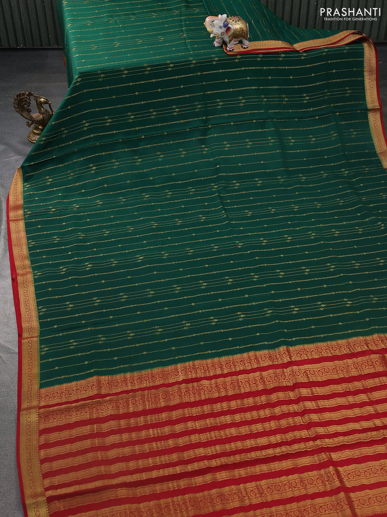Pure mysore silk saree bottle green and red with allover zari weaves and zari woven border