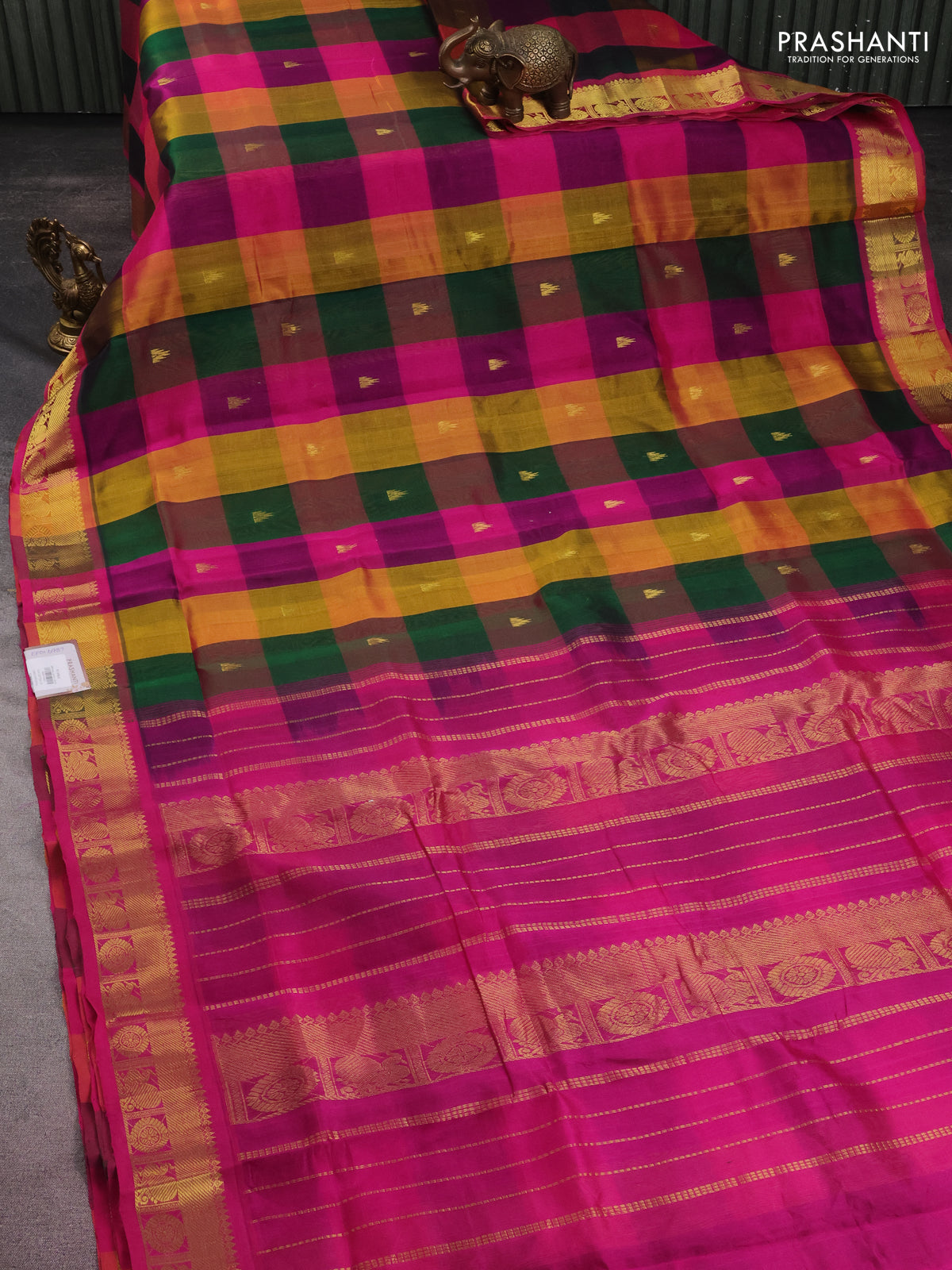 10 yards silk cotton saree multi colour and pink with allover paalum pazhamum checks & buttas and zari woven border