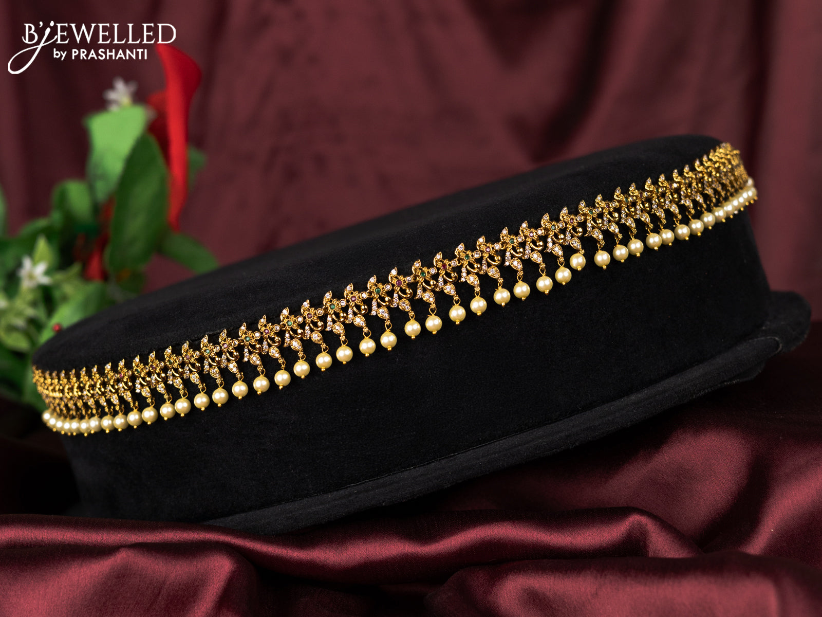 Antique hip chain with kemp & cz stones and pearl hangings