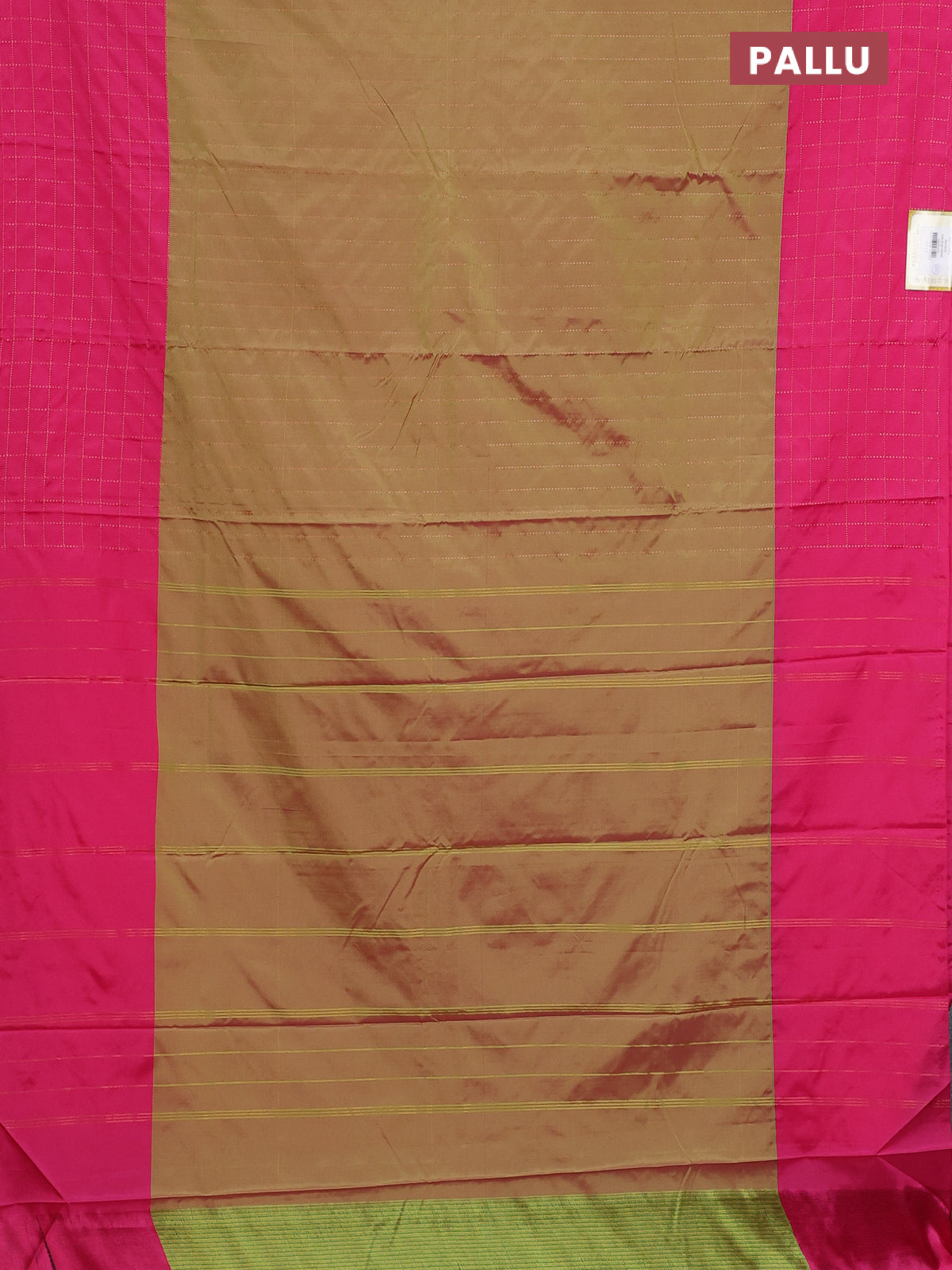 Arani semi silk saree dual shade of sap green and pink with allover copper zari weaves and zari checked border