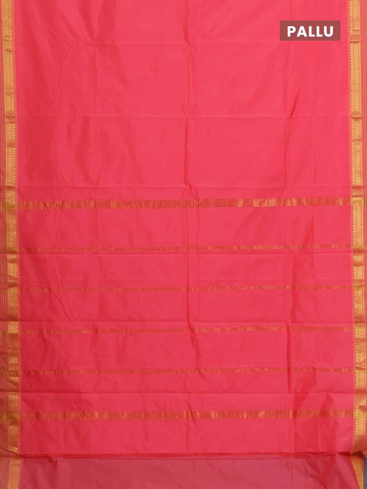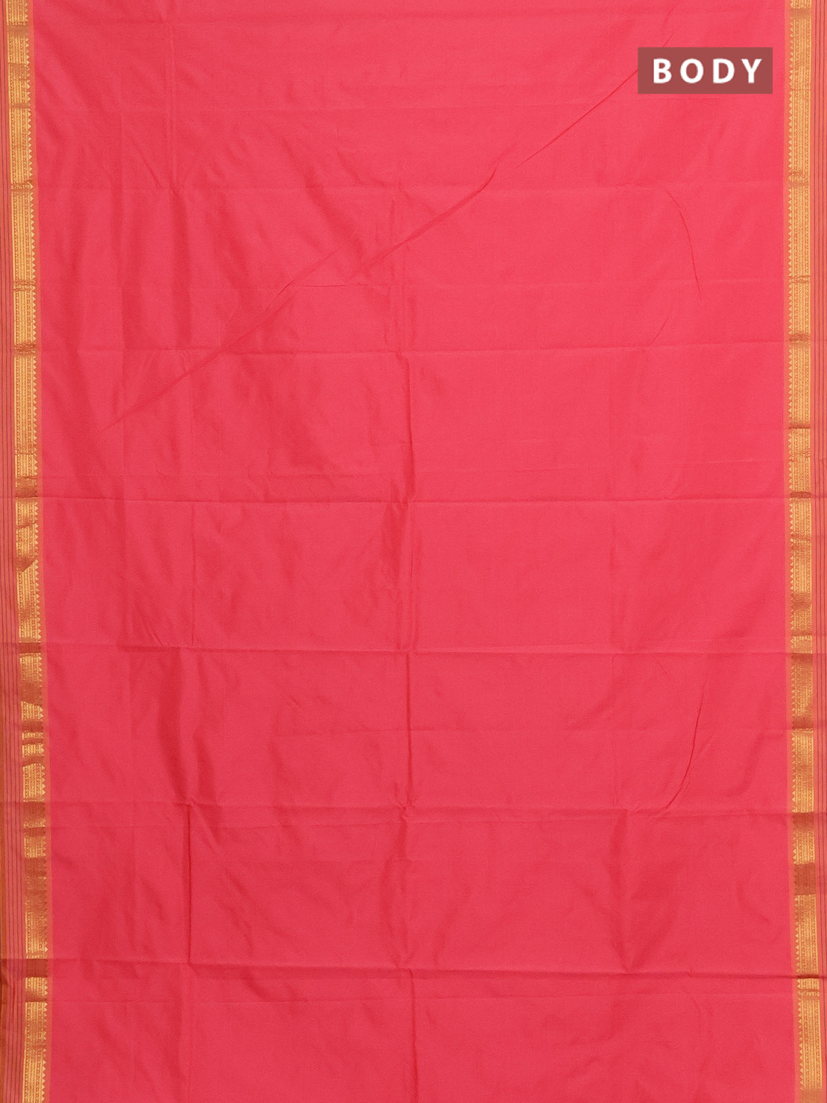 Arani semi silk saree peach pink and dual shade of yellow with plain body and zari woven simple border