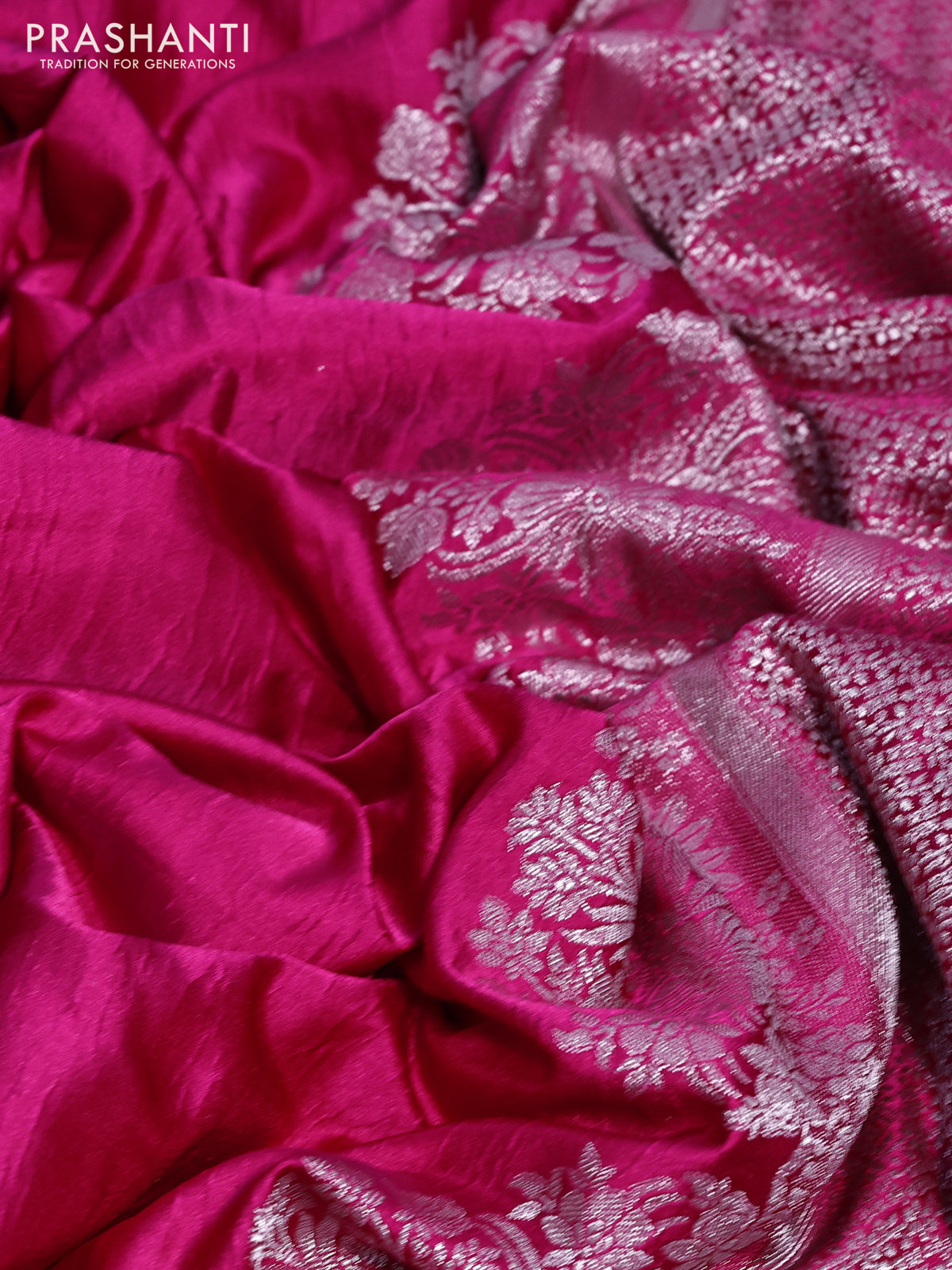 Banarasi crush crepe saree pink with plain body and silver zari woven floral border