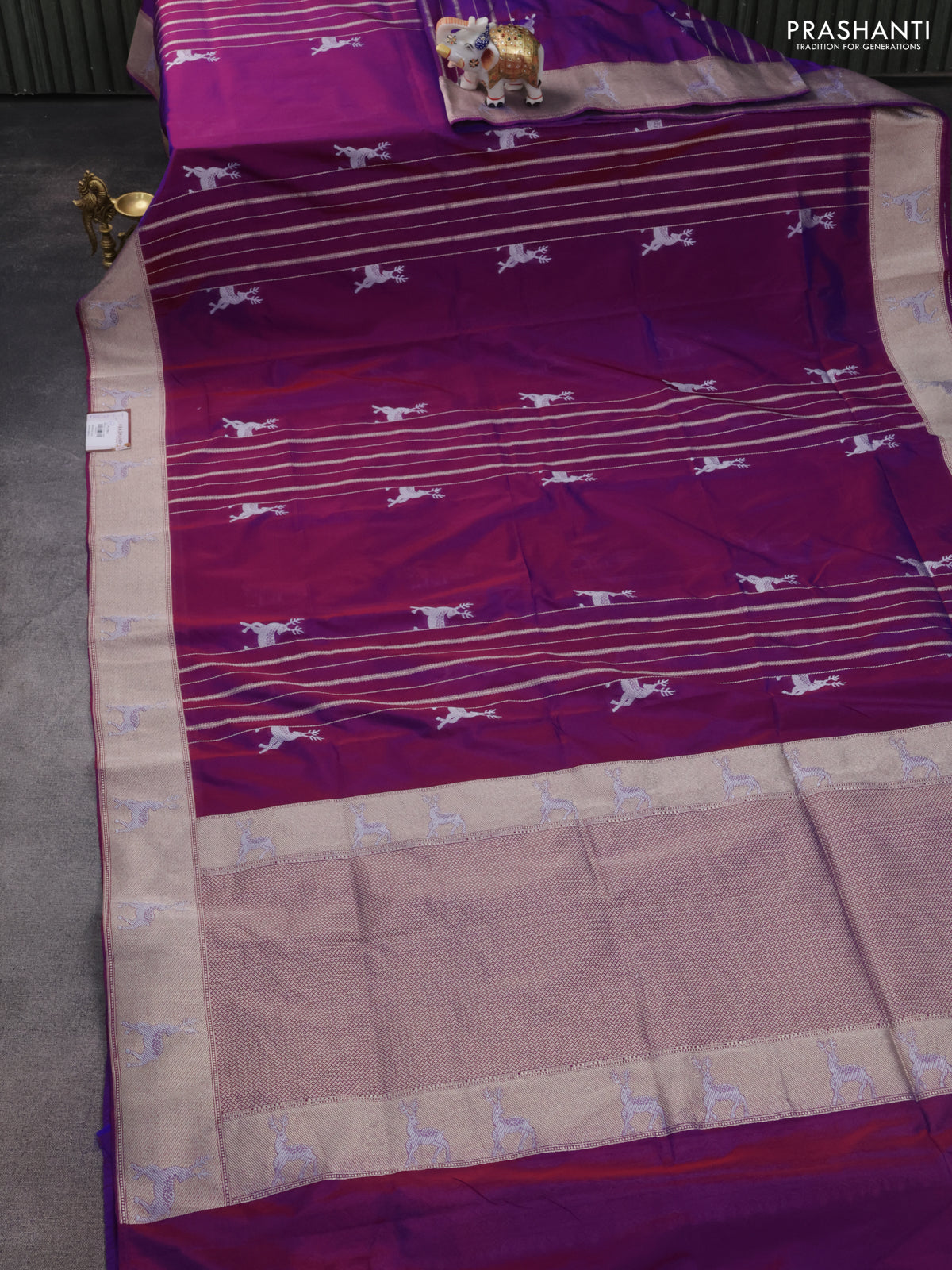 Banarasi semi katan silk saree purple with allover silver & gold zari weaves and deer design zari woven border