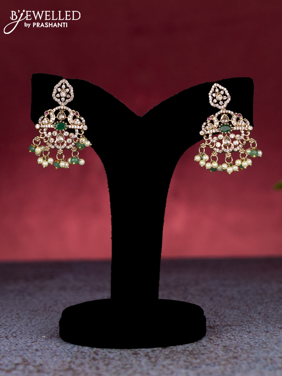 Beaded triple layer mint green necklace peacock design with cz stones and pearl & beads hangings in victorian finish