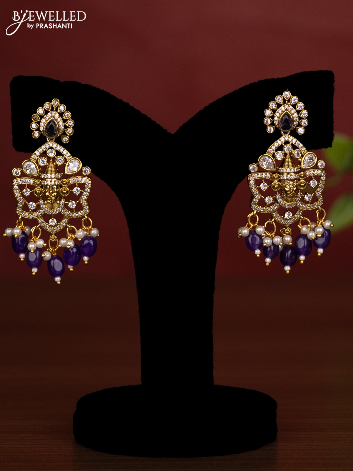 Beaded triple violet necklace tiruapti balaji pendant with cz stones and pearl & beads hanging in victorian finish