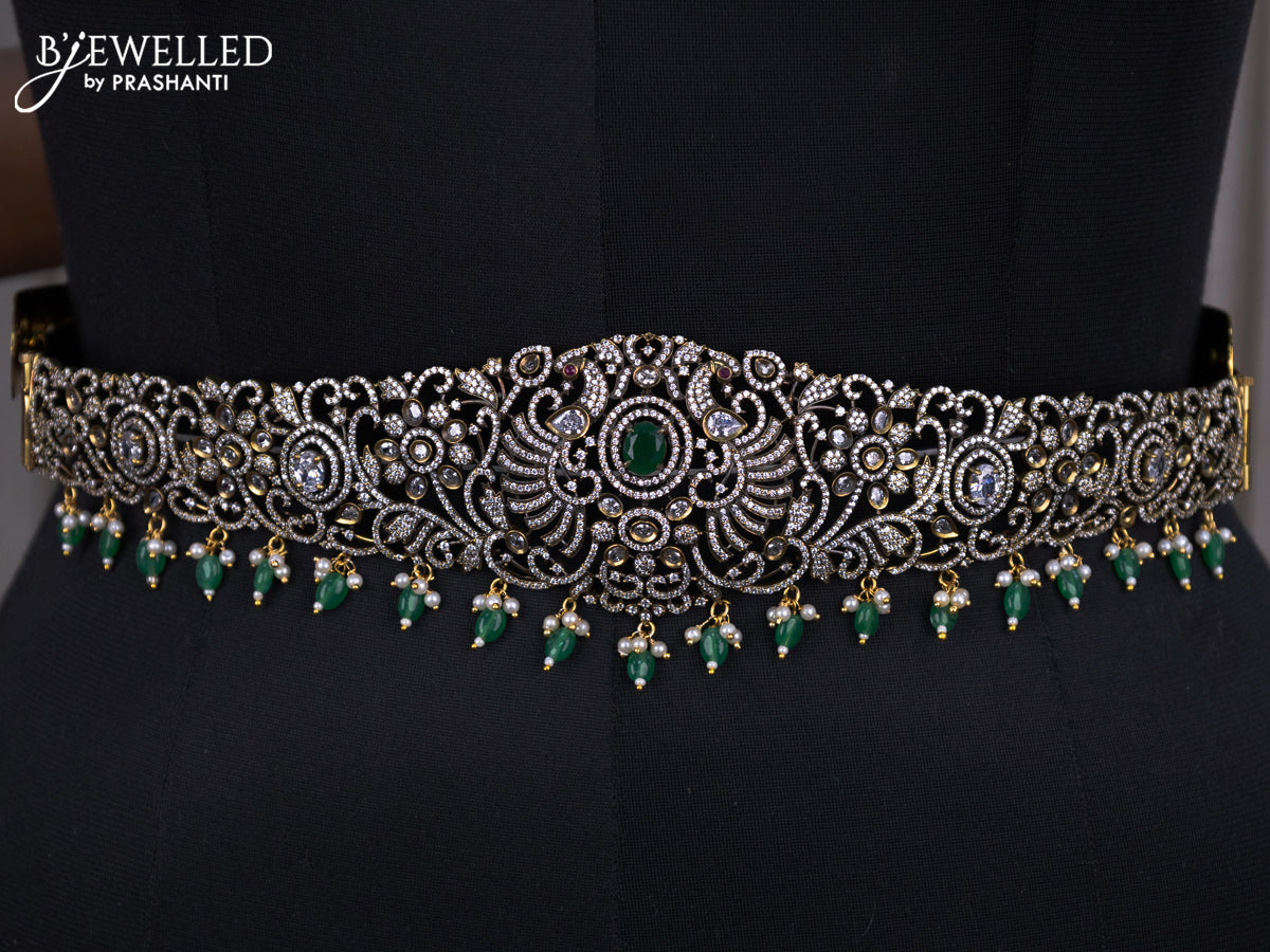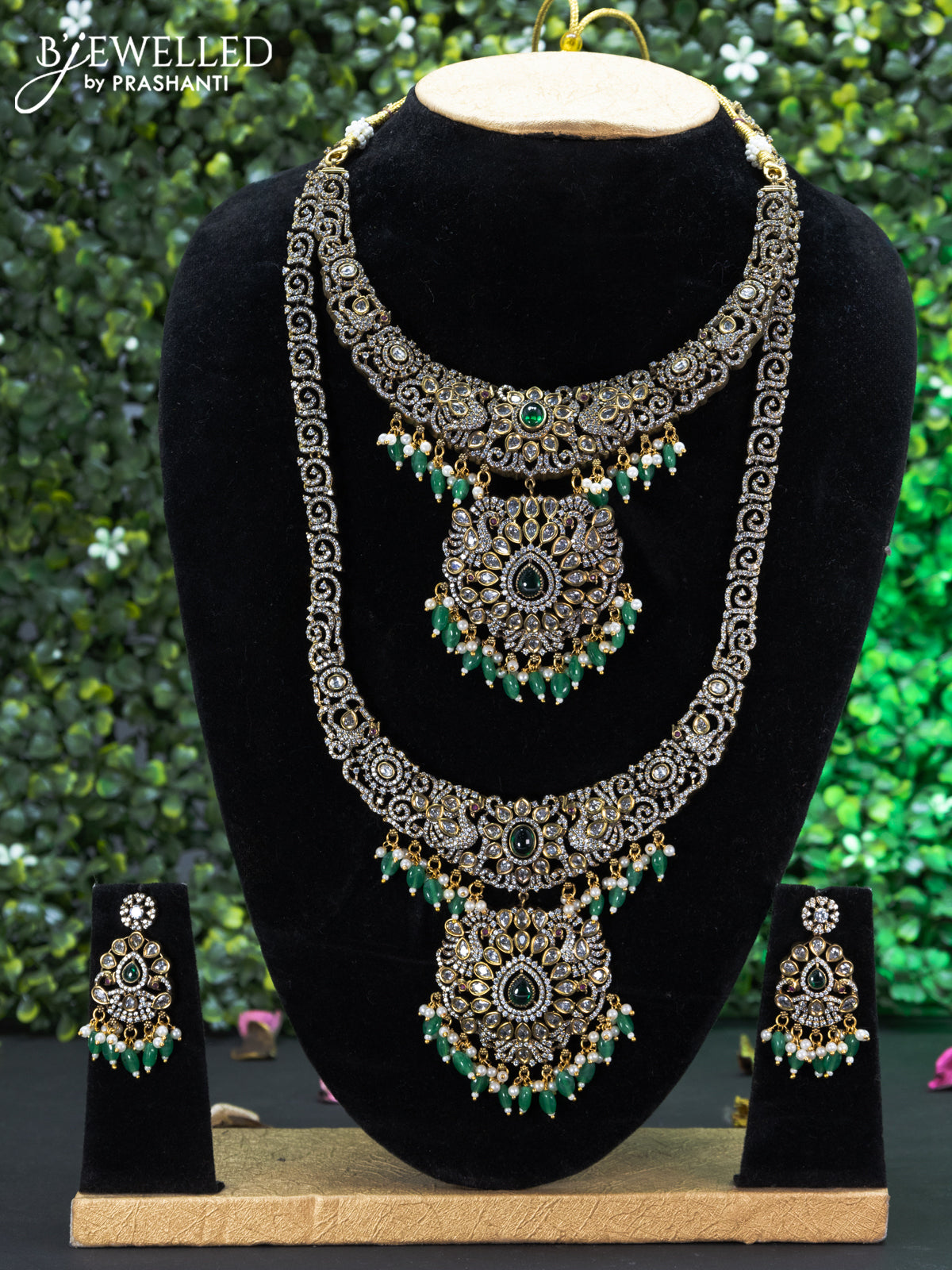 Bridal set with emerald & cz stones and beads hangings in victorian finish