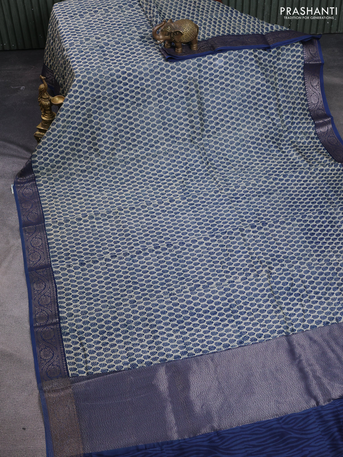 Chanderi silk cotton saree beige and peacock blue with allover butta prints and banarasi style border