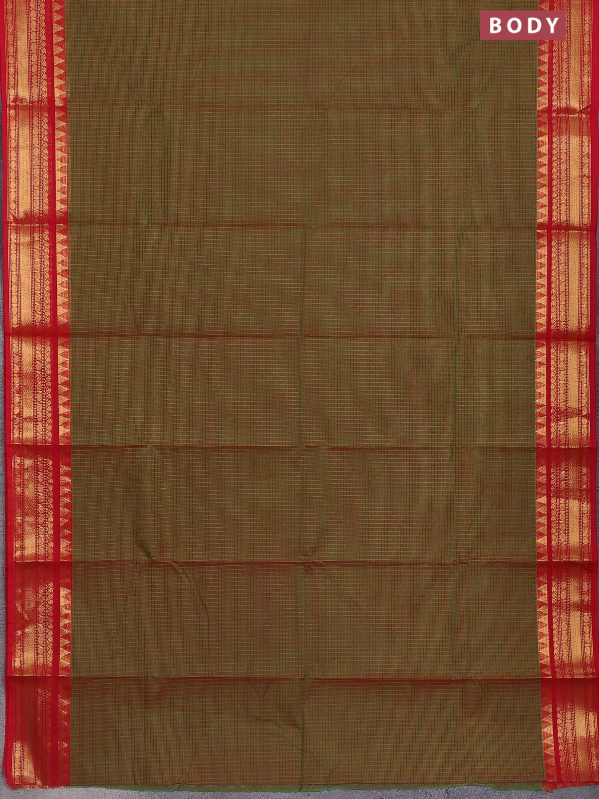 Chettinad cotton saree dual shade of green and red with allover checked pattern and temple disign zari woven border
