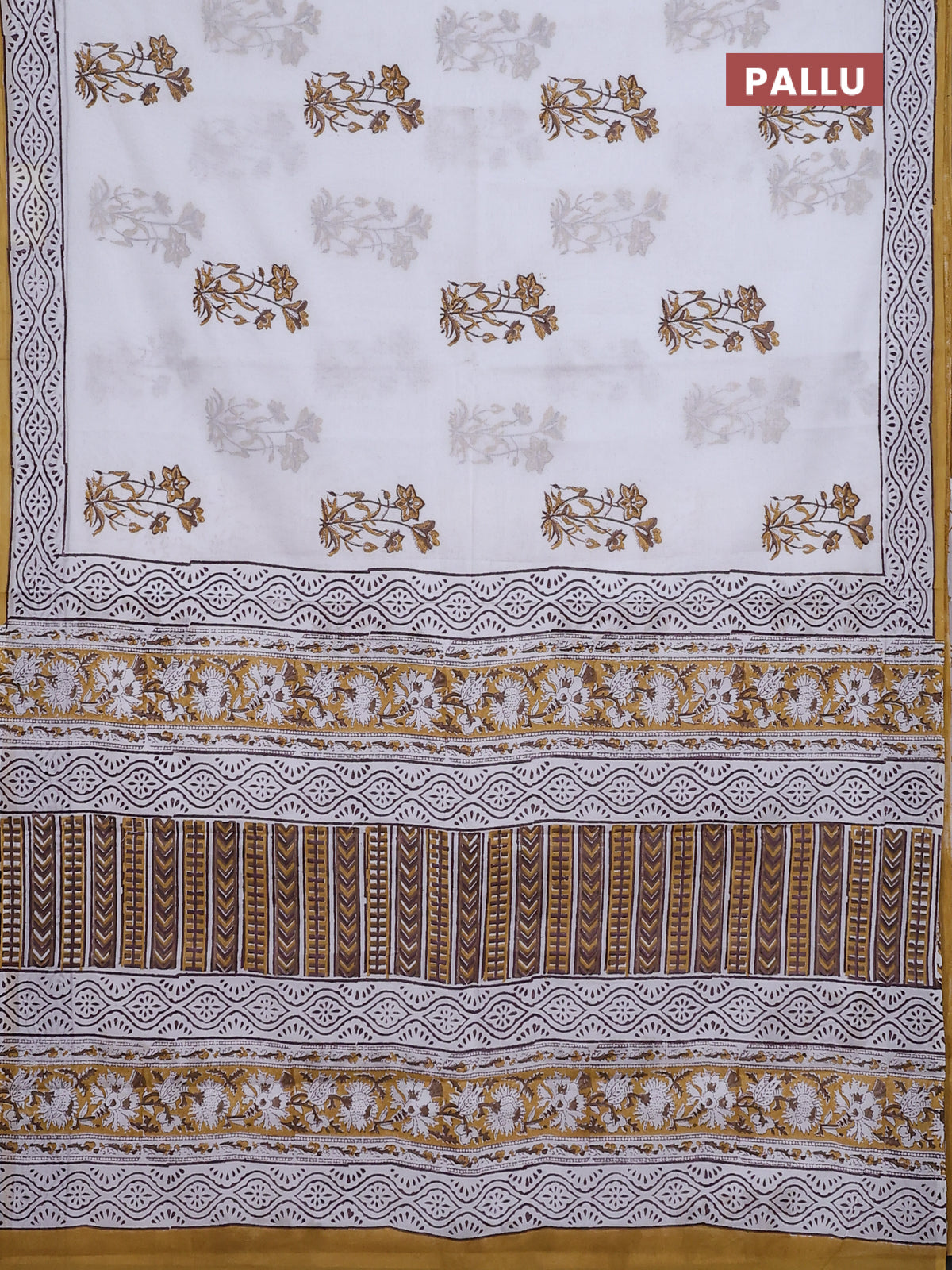 Jaipur cotton saree off white and mustard with floral butta prints and printed border