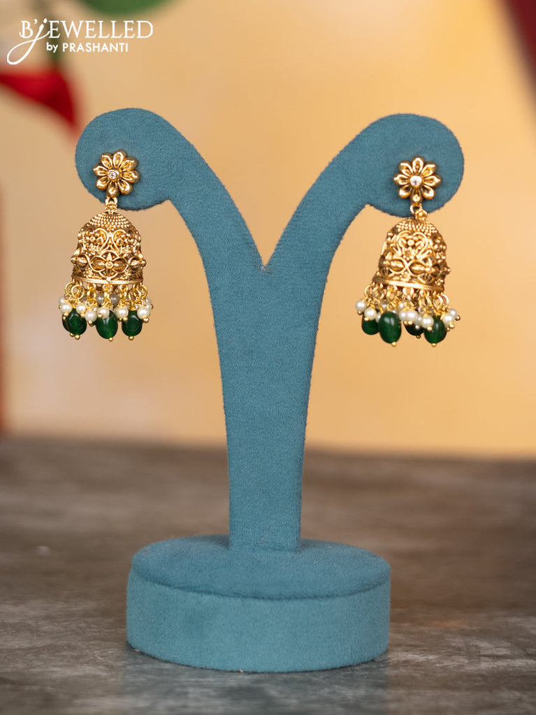 Antique jhumkas with kemp & cz stones and pearl & green beads hangings