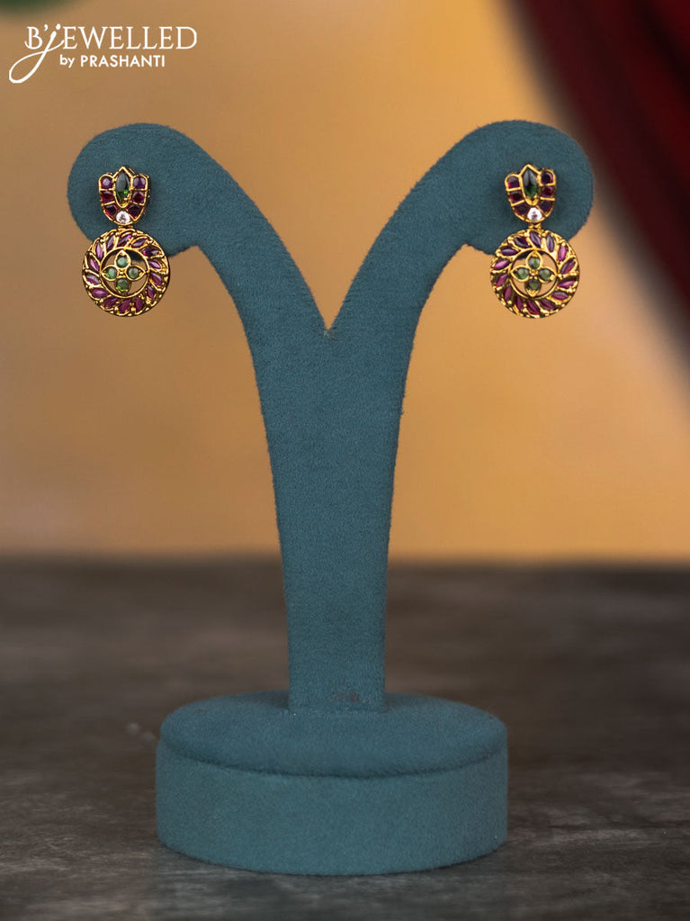 Antique jhumkas with kemp & cz stones and pearl & red beads hangings