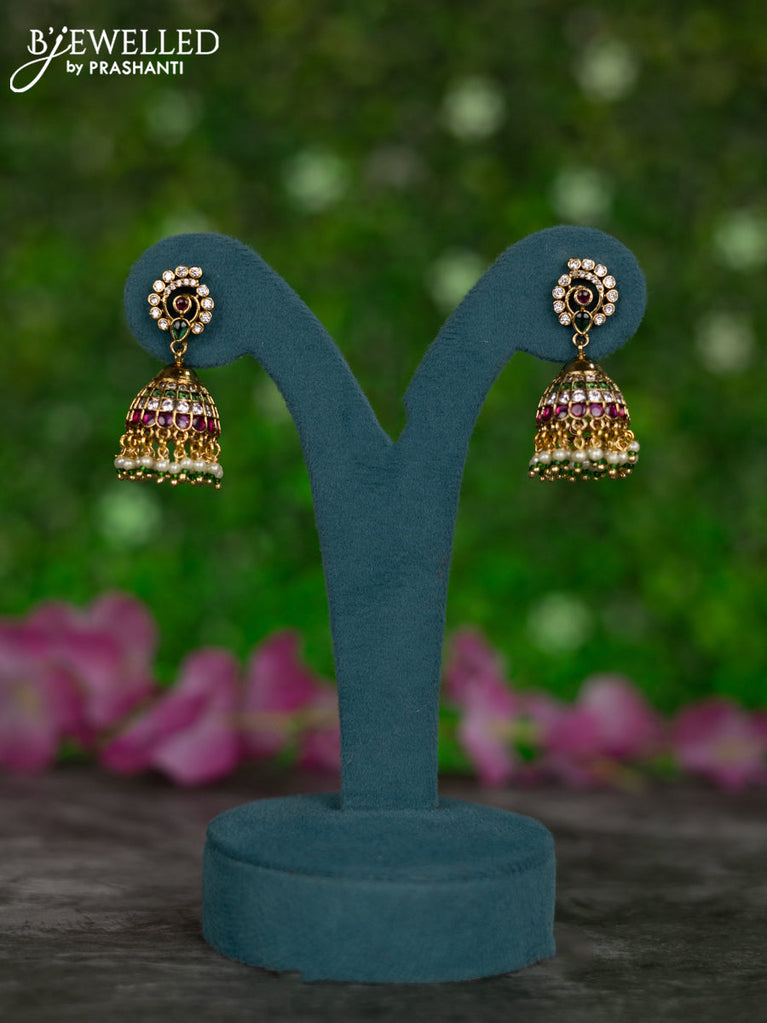 Antique jhumkas with kemp & cz stones and pearl hangings