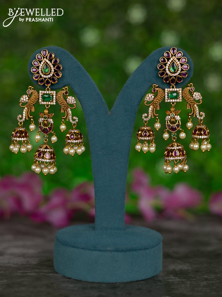 Antique jhumkas peacock design with kemp & cz stones and pearl hangings