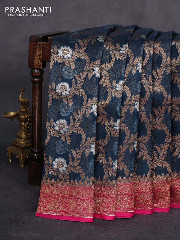 Banarasi organza silk saree peacock blue and pink with allover thread & zari weaves and woven border