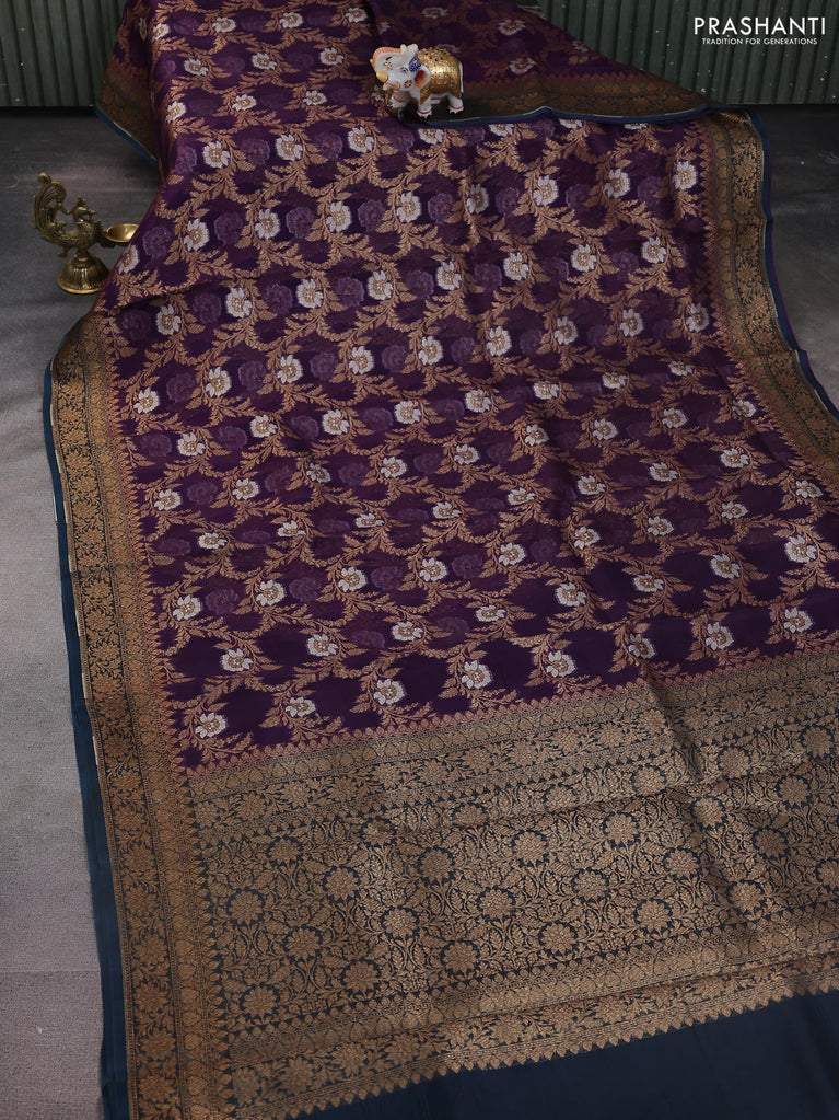 Banarasi organza silk saree violet and peacock green with allover thread weaves and woven border