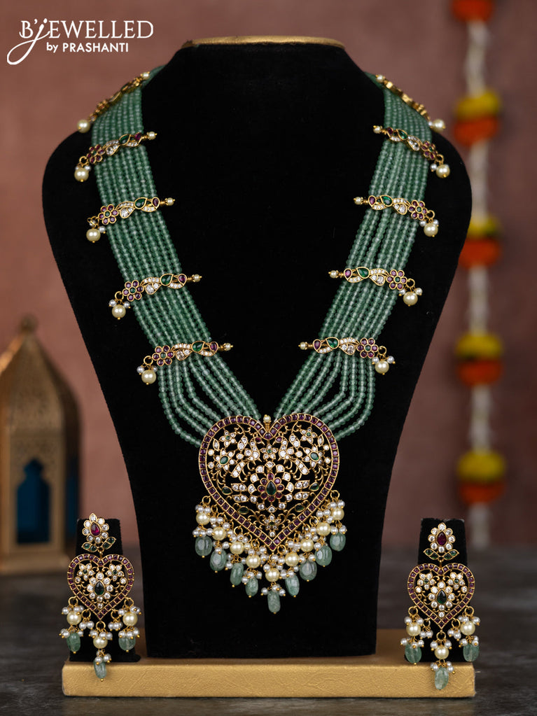Beaded multilayer mint green necklace with kemp & cz stones and pearl hangings in victorian finish