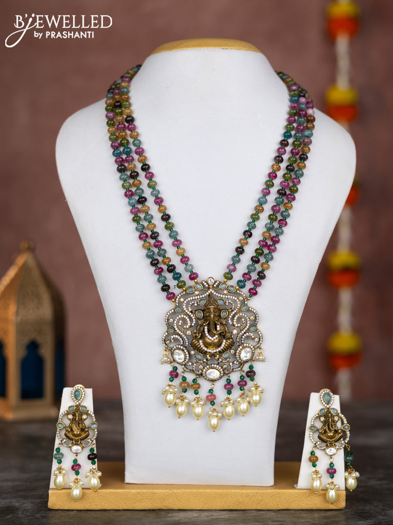 Beaded triple layer multicolour necklace ganesha pendant with mint green , kundan & cz stones and pearl & beads hangings in victorian finish