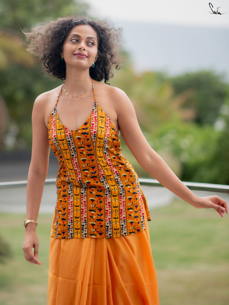 The mustard cotton kurta features a contrast hand-embroidered yoke with birds, delicate, thoughtful, and full of movement. It comes with a gentle V neck, short sleeves finished with scalloped edges, and pockets on both sides for everyday ease. The matching cotton pants keep things comfortable with a scalloped hem, elasticated waist, and side pockets.