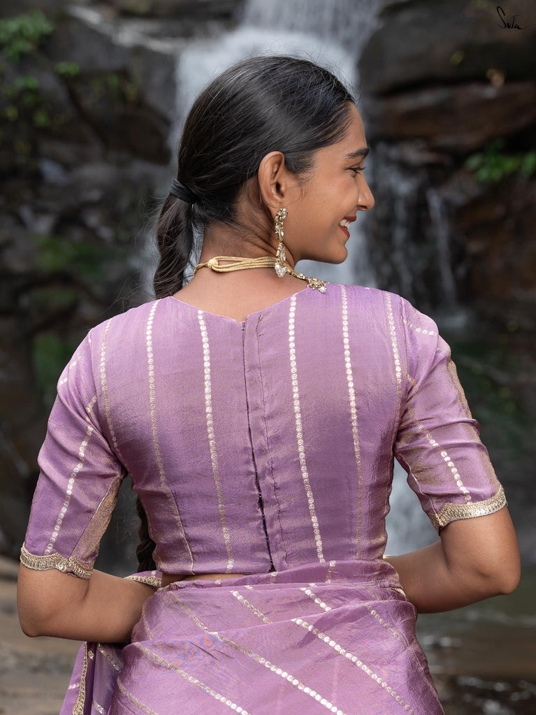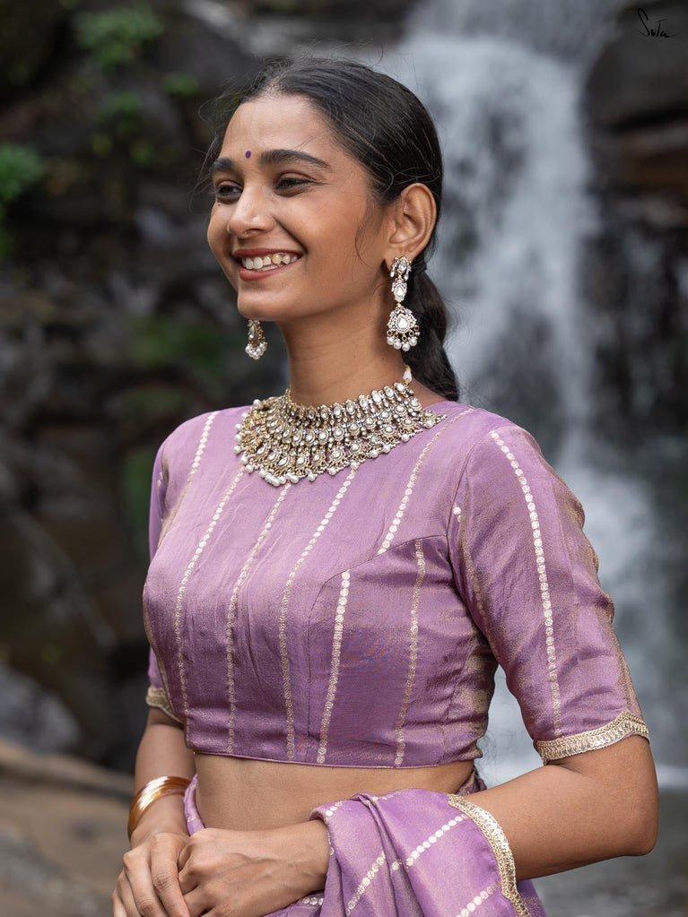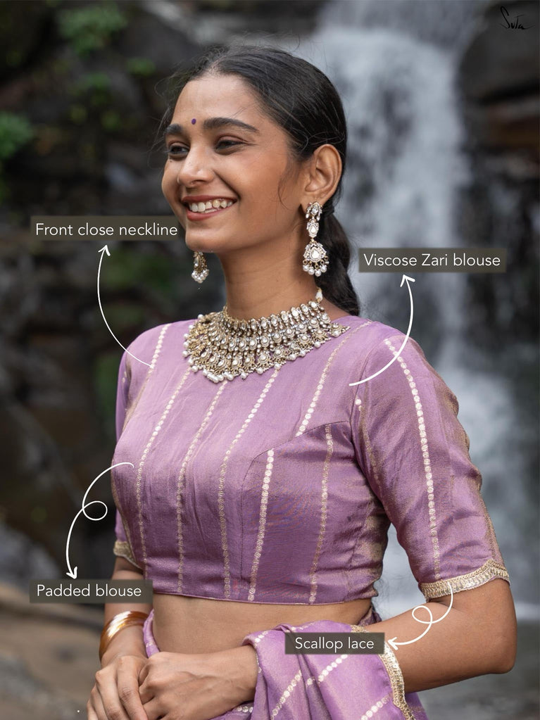 This blouse is made for creative styling possibilities. The lavender shade radiates serene confidence and subtle allure. Viscose zari shimmers with a soft, ethereal glow. Zari stripes add gentle movement and light. Scalloped lace embroidery traces every edge with intricate finesse. The close-neck front frames the collar with grace. Half sleeves with scallop detailing lend delicate charm. Padded structure and back hook ensure a perfect fit.