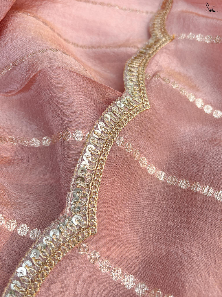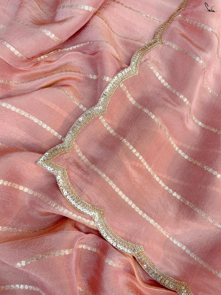 A saree that feels like sunrise caught in silk. The peach hue radiates warmth, wrapping you in a soft, flattering glow. Viscose zari lends it a molten gleam that moves with you. The zari stripes glint like light skimming over water. Embroidered scallop lace frames it with an air of effortless allure.