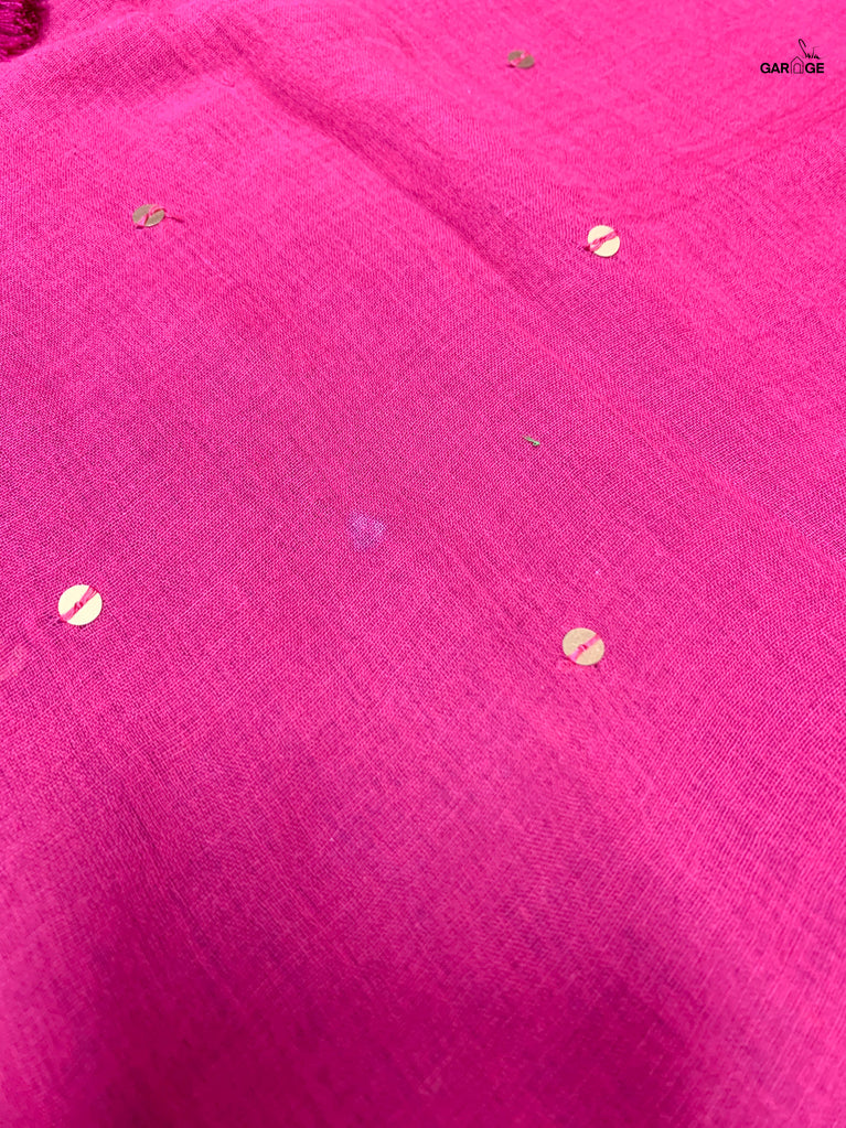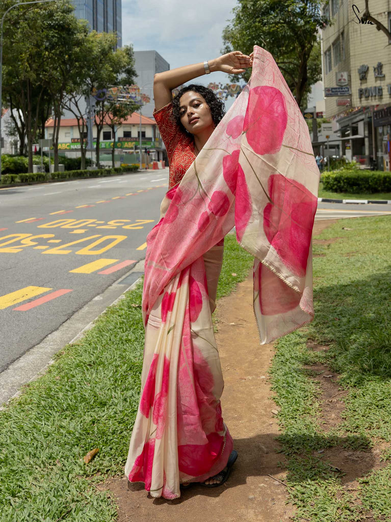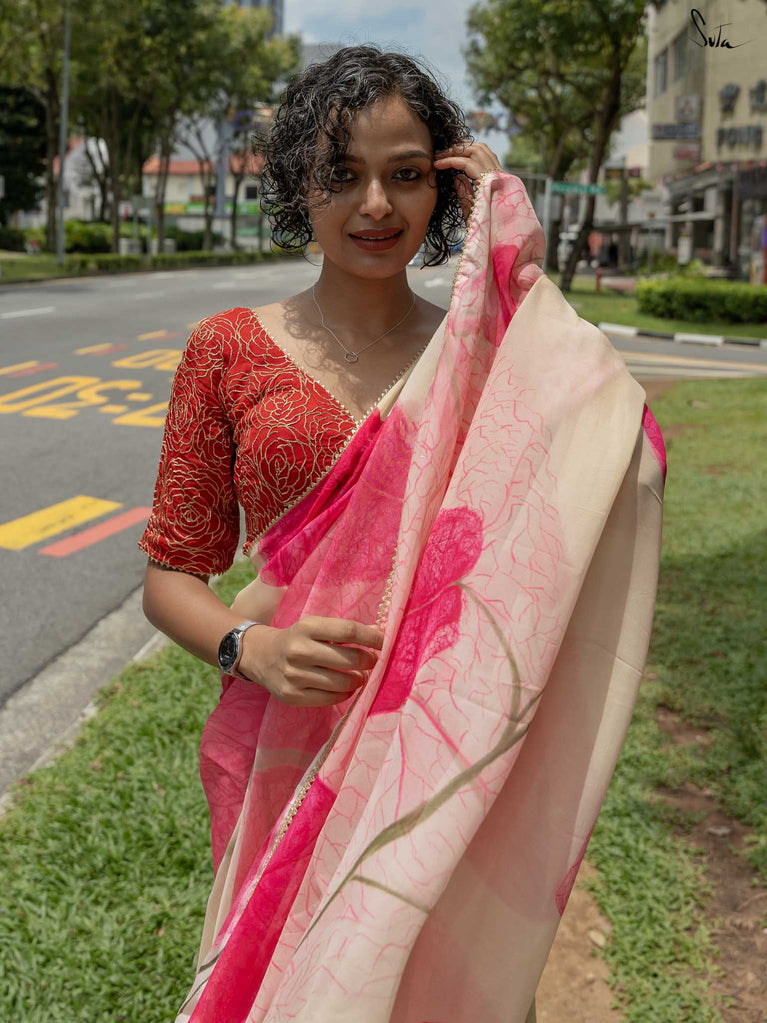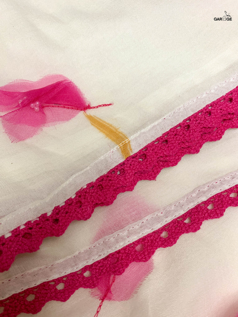 This white mul cotton saree feels like a quiet autumn afternoon soft, dreamy, and full of grace. Scattered across its canvas are delicate, hand-stitched bougainvillea flowers in pink organza, each one blooming like a secret, captured mid-fall. The 3D florals add a romantic, whimsical texture, while lace finishing and tassels bring a gentle flow with every step. It’s not just a saree it’s the rustle of petals, the hush of breeze, and the feeling of autumn… no matter the season. Wear it when you want to feel a little closer to nature. Or yourself.