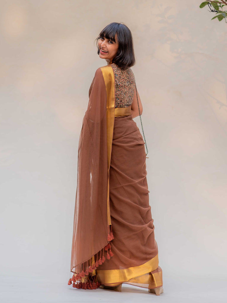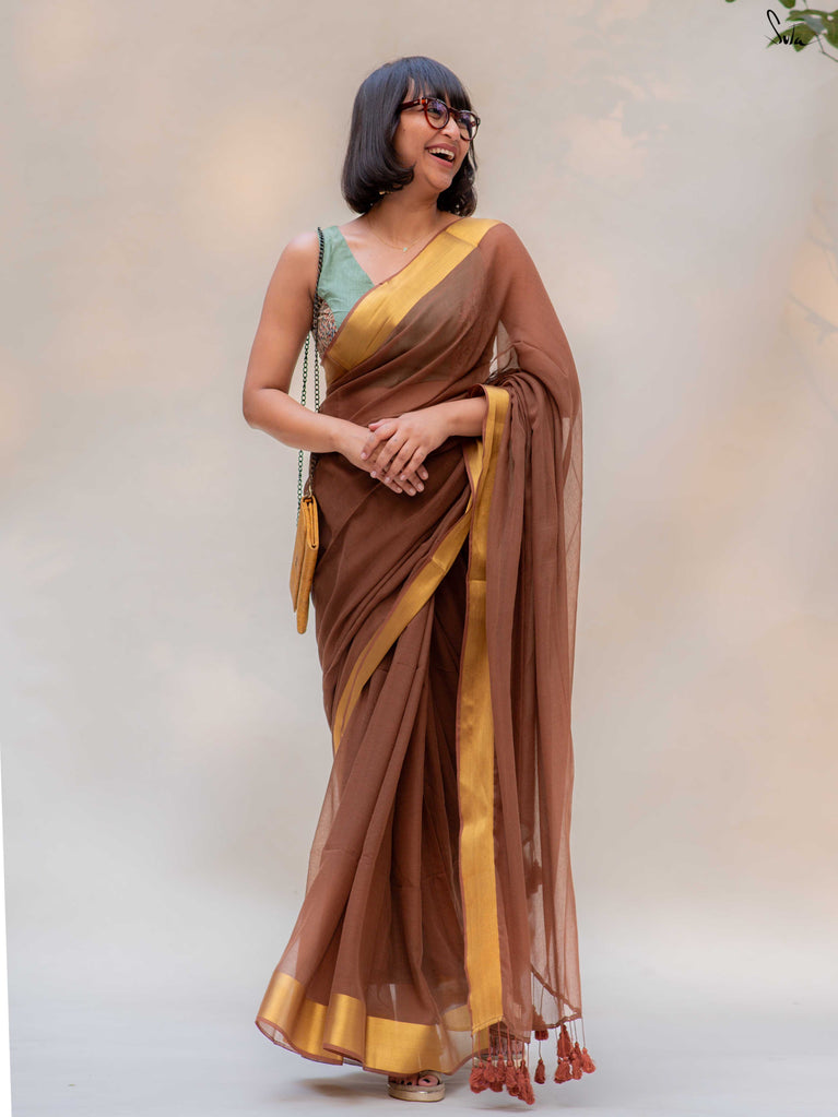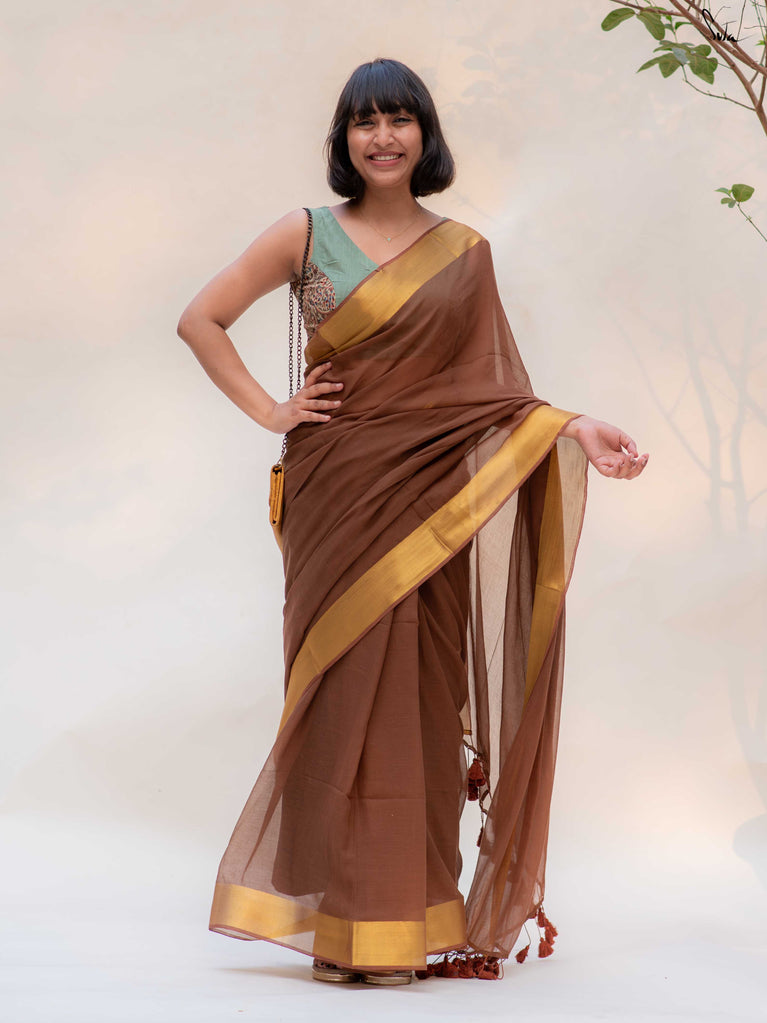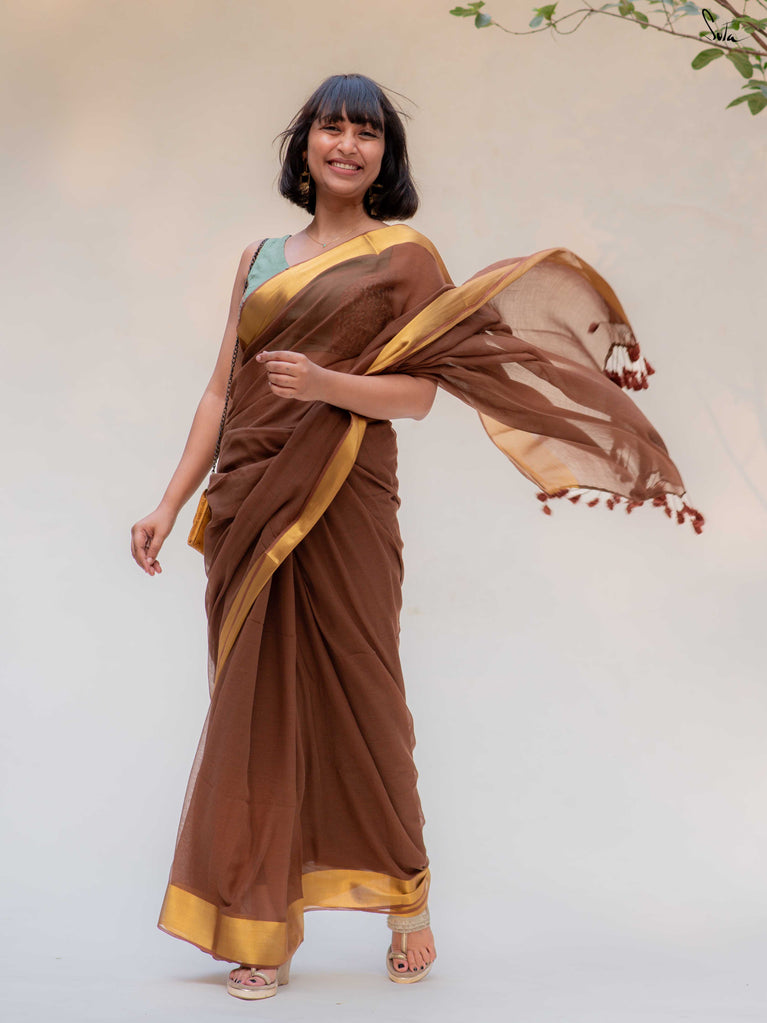 Warm, grounded, and quietly elegant - Clove Phool is summer cotton in a deeper, richer tone. Crafted in airy mul cotton, this brown saree drapes softly and feels feather-light on the skin. A classic gold zari border adds just enough glow, keeping the look timeless and easy.It’s the kind of saree you reach for on long days, slow evenings, and everything in between - effortless, breathable, and endlessly wearable.