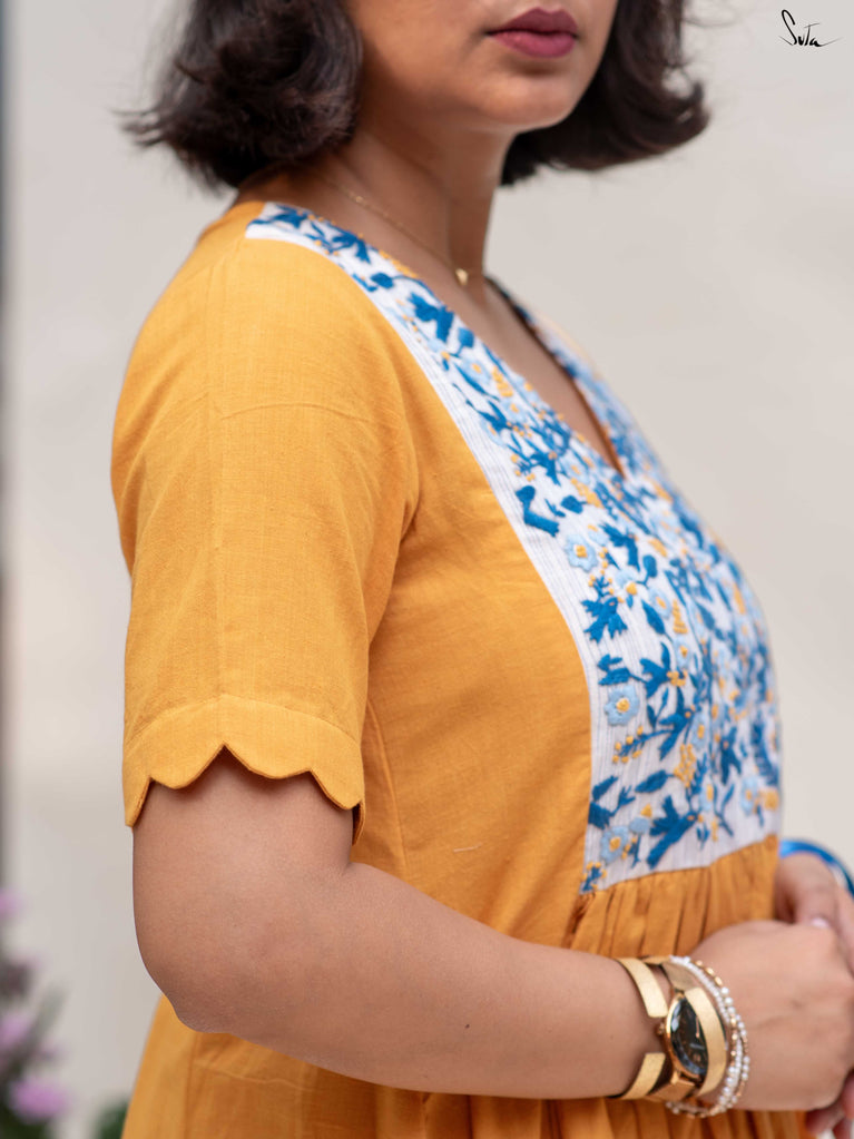 This mustard cotton dress features a contrast hand-embroidered yoke with birds - small details that make you pause and look closer. The V neck keeps it easy, the short sleeves with scalloped edges add a gentle finish, and pockets on both sides make it practical for everyday wear.