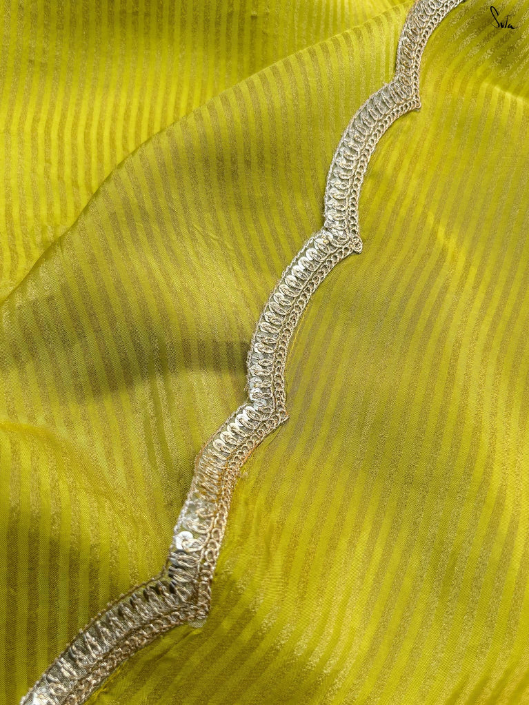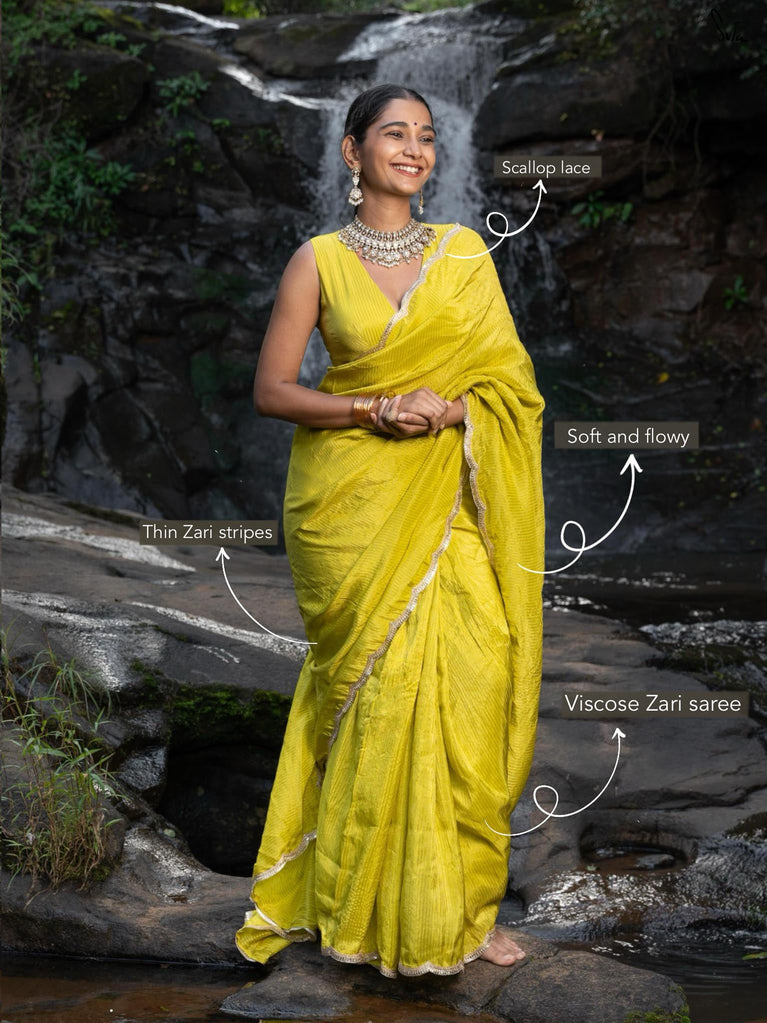 This looks straight out of a runway. A saree that feels like a burst of electric energy. The neon green hue commands attention. Viscose zari flickers with vibrant, metallic brilliance. Zari stripes spark with dynamic movement across the fabric. Scalloped lace embroidery adds a touch of intricate artistry to the bold palette.