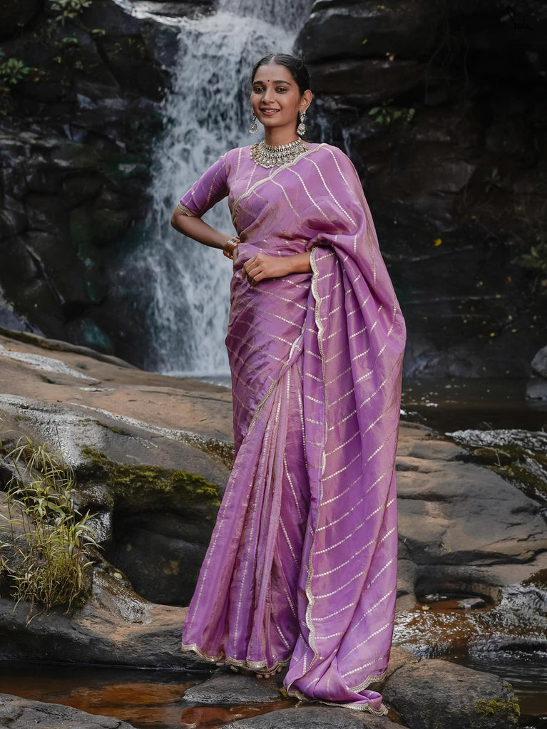 A saree that feels like twilight settling over lilac fields. The lavender shade soothes yet captivates. Viscose zari threads glimmer like dusk light on silk. Subtle zari stripes lend it rhythm and glamour. The scalloped lace embroidery trails along the edges like poetry in motion. It makes you feel serene, radiant, and beautifully unhurried.