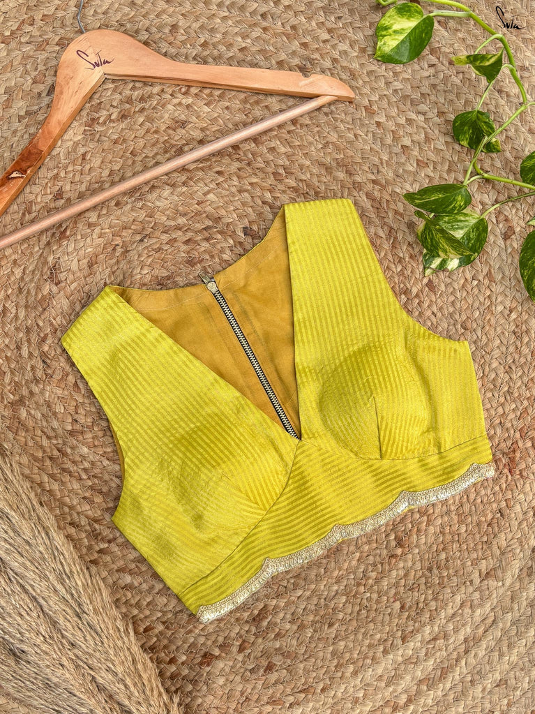 A blouse that feels like a jolt of electric confidence. The neon green hue radiates bold energy and fearless charm. Viscose zari shimmers with a vibrant, metallic gleam. Zari stripes and scalloped lace embroidery add dynamic texture and movement. The V-neck front accentuates the neckline with striking allure. The sleeveless cut keeps it sharp and modern. Back zip ensures a sleek, flawless fit.