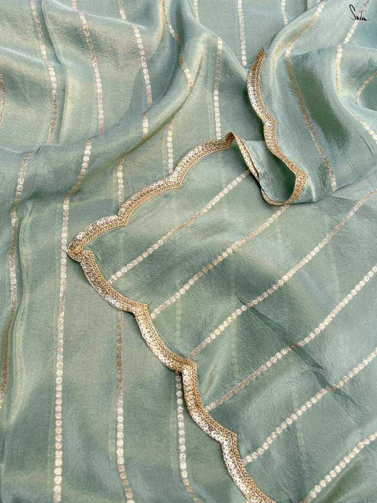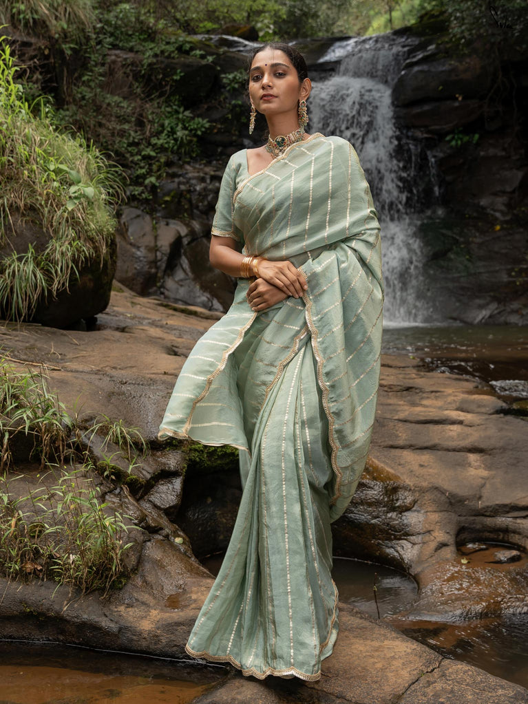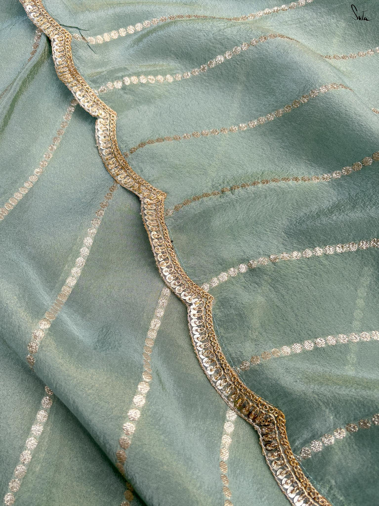 A saree that feels like a breath of calm. The mint hue soothes the eyes and lightens the mood. Zari stripes glint gently, adding a hint of celebration to its serenity. The scalloped lace embroidery traces every edge with a tender, intricate calm. It is an incomparably fresh look.