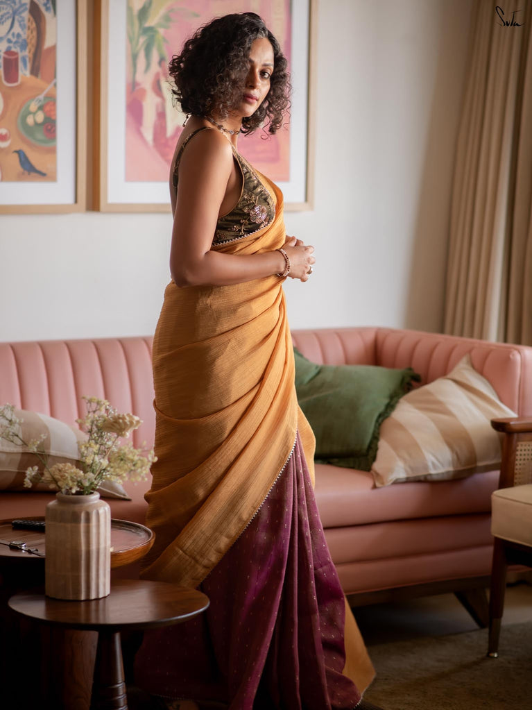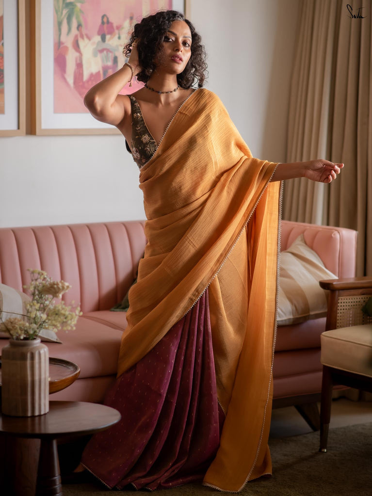 Two colours meet like melodies in conversation. This crushed viscose zari saree brings together the warmth of mustard and the depth of purple, creating a striking contrast that feels both bold and harmonious. The textured crush of the viscose lends the drape an effortless fluidity, while delicate gold lace along the borders adds just the right hint of festive shimmer.