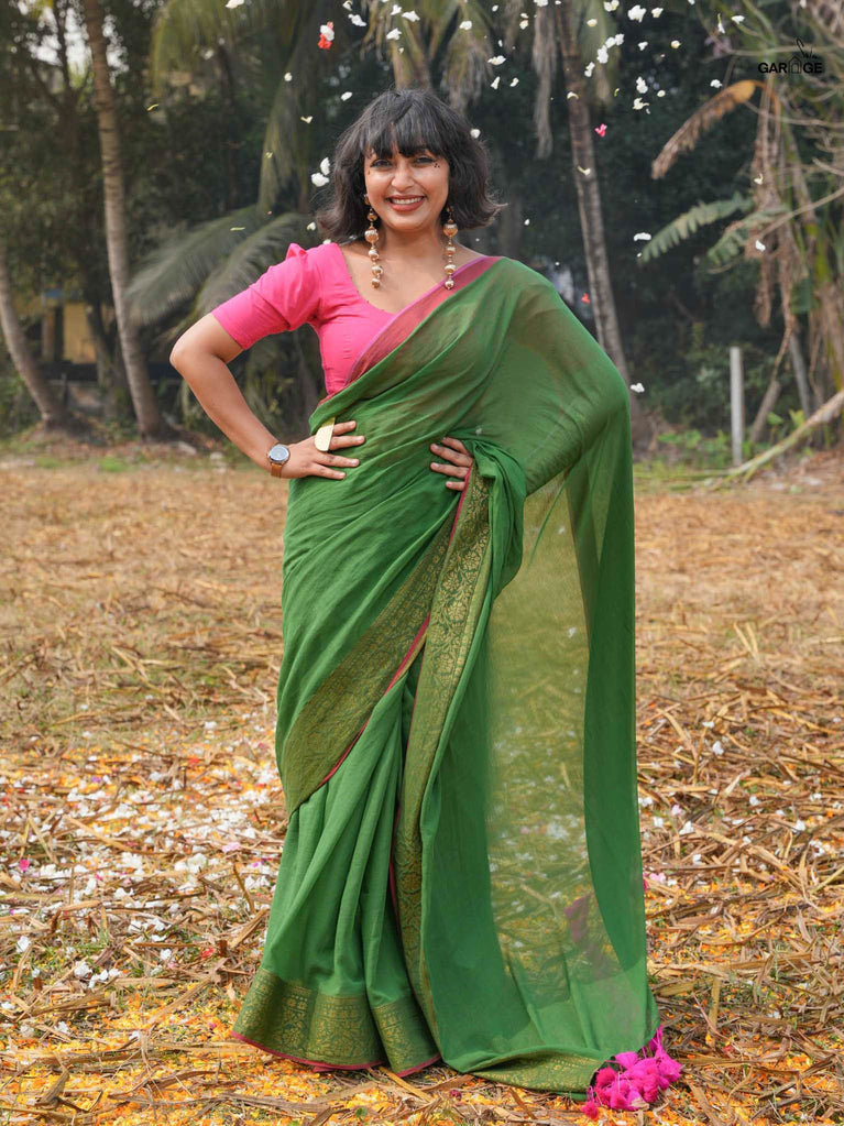 Deep, rich, and full of soul, this olive green mul cotton saree is a tribute to the timeless beauty of henna, the intricate art that decorates the hands of every Holi celebrant. The jacquard weave and zari-woven contrast border bring a subtle elegance, while the shimmering tassels capture the magic of the festival. This saree speaks of connections, of traditions passed through generations, and of the deep beauty found in every celebration.